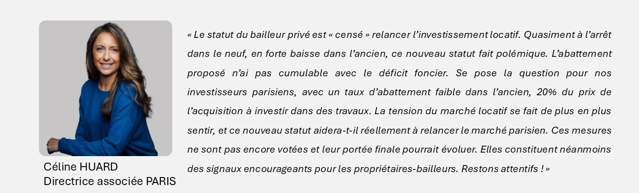 Le statut du bailleur privé a été adopté par l’Assemblée nationale puis par le Sénat en novembre 2025. Il constitue l’une des mesures les plus structurantes du PLF 2026 pour l’immobilier. Il vise à redynamiser la location nue. Celle-ci est aujourd’hui pénalisée par la hausse des coûts, la tension réglementaire et la disparition progressive des anciens dispositifs fiscaux.