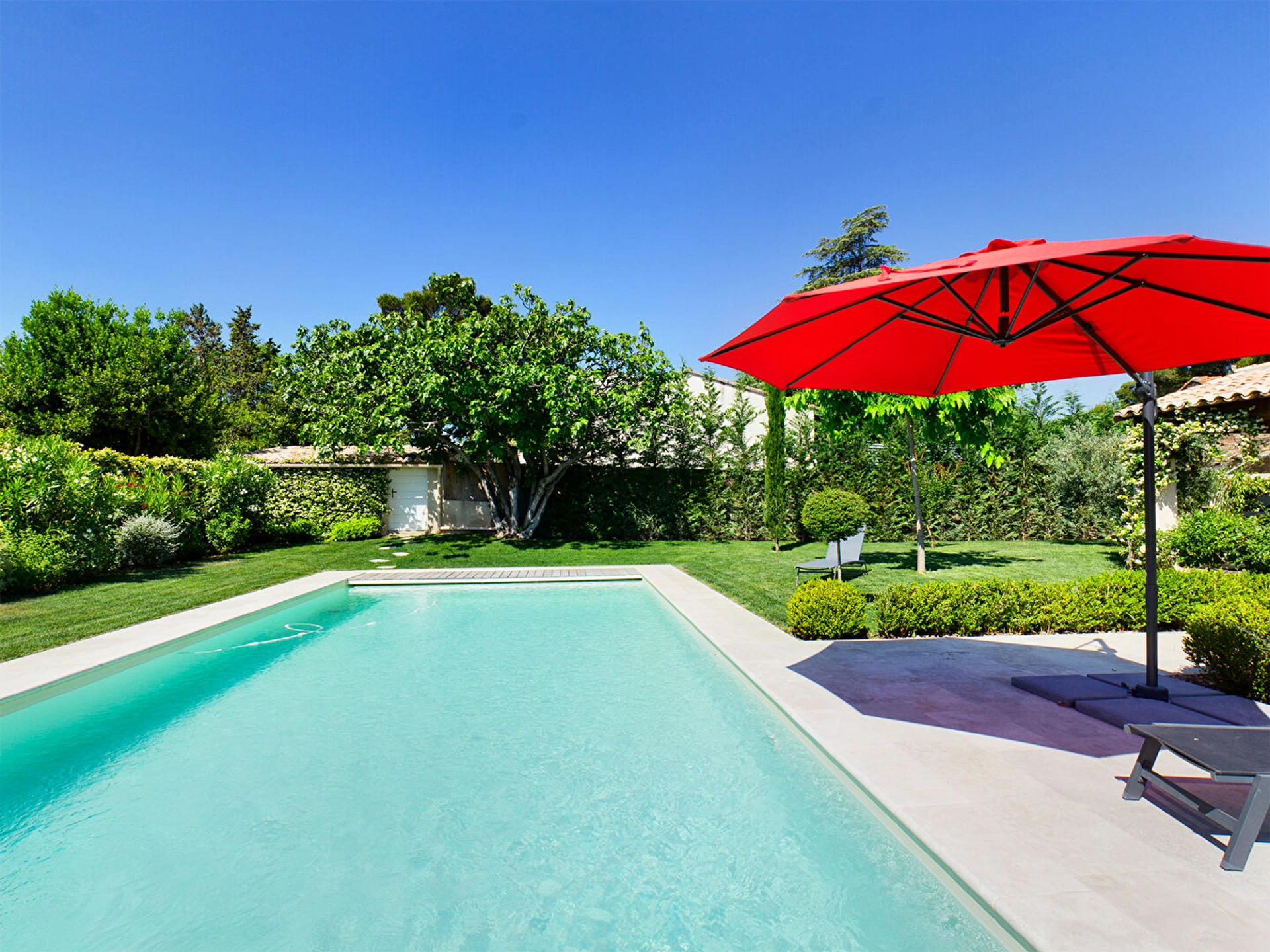 A l'extérieur, profitez d'un cadre enchanteur avec une piscine chauffée en hors saison (10 x 5 m), sécurisée par un volet roulant. Nichée au coeur d'un jardin paysager soigneusement arboré, elle constitue un véritable écrin de détente, parfait pour savourer le climat ensoleillé de la Provence.