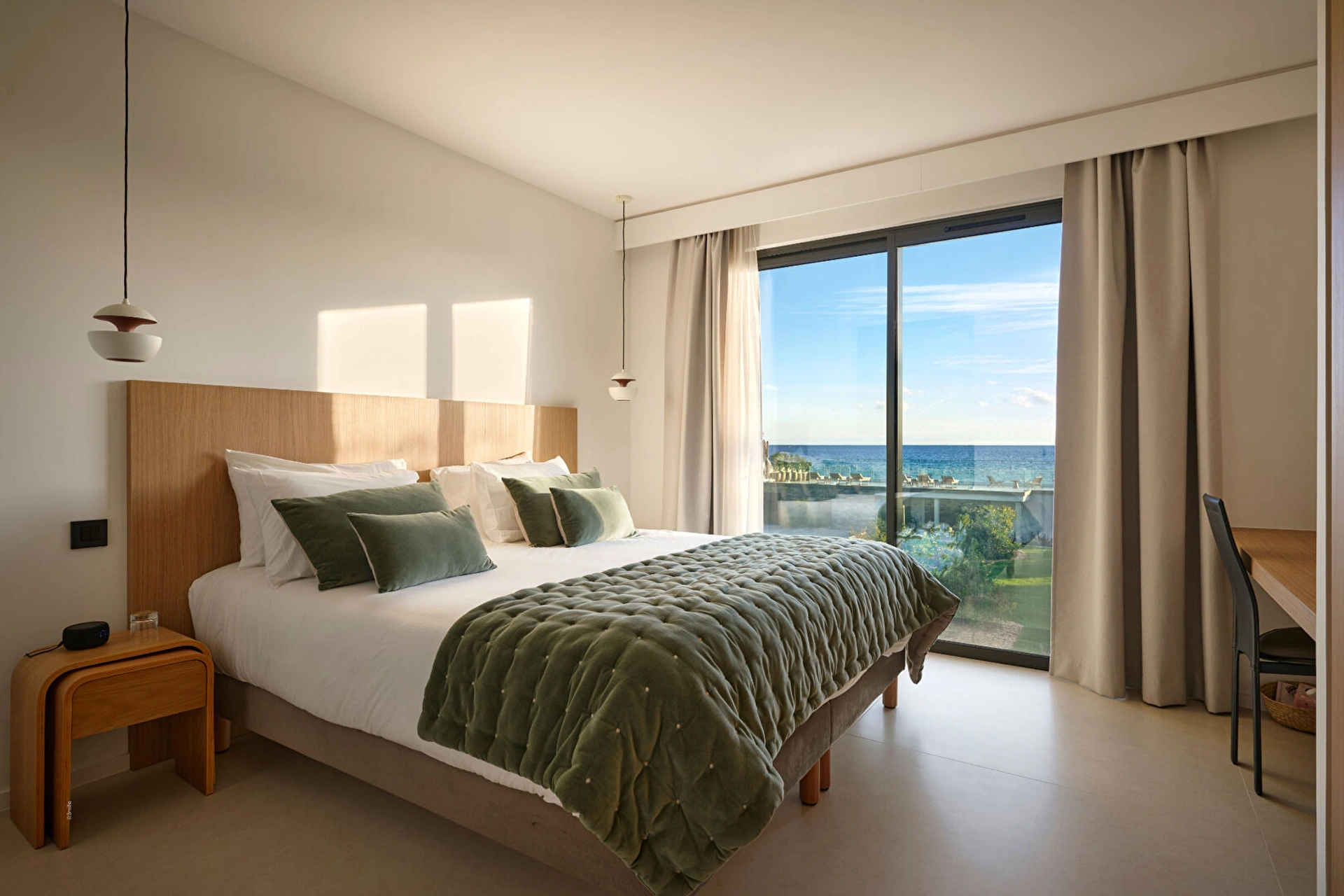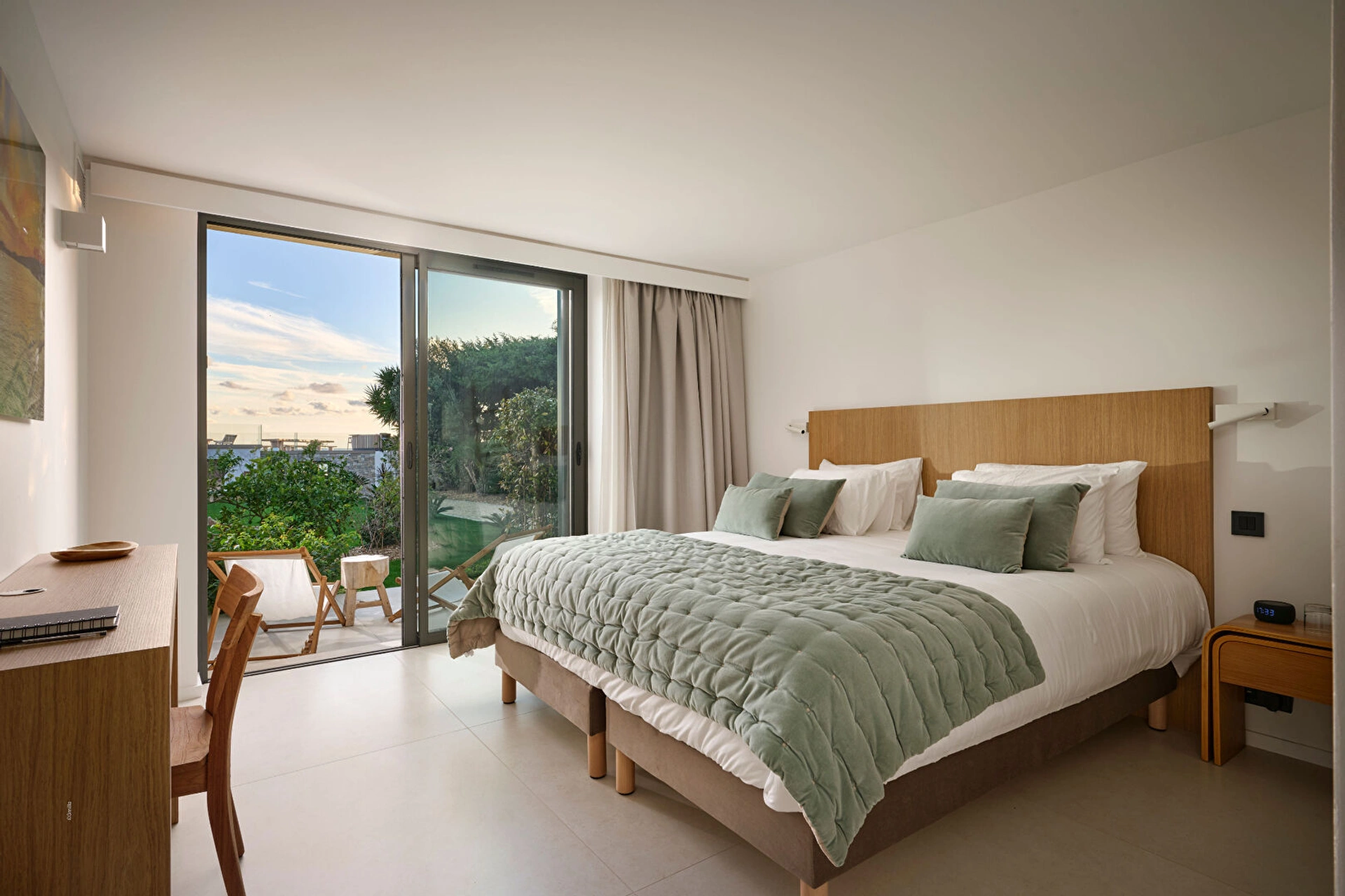 La Maison principale : 9 suites (dont 1 PMR) avec salle de bain et WC privatifs, climatisation, vu mer et jardin, accès terrasse.