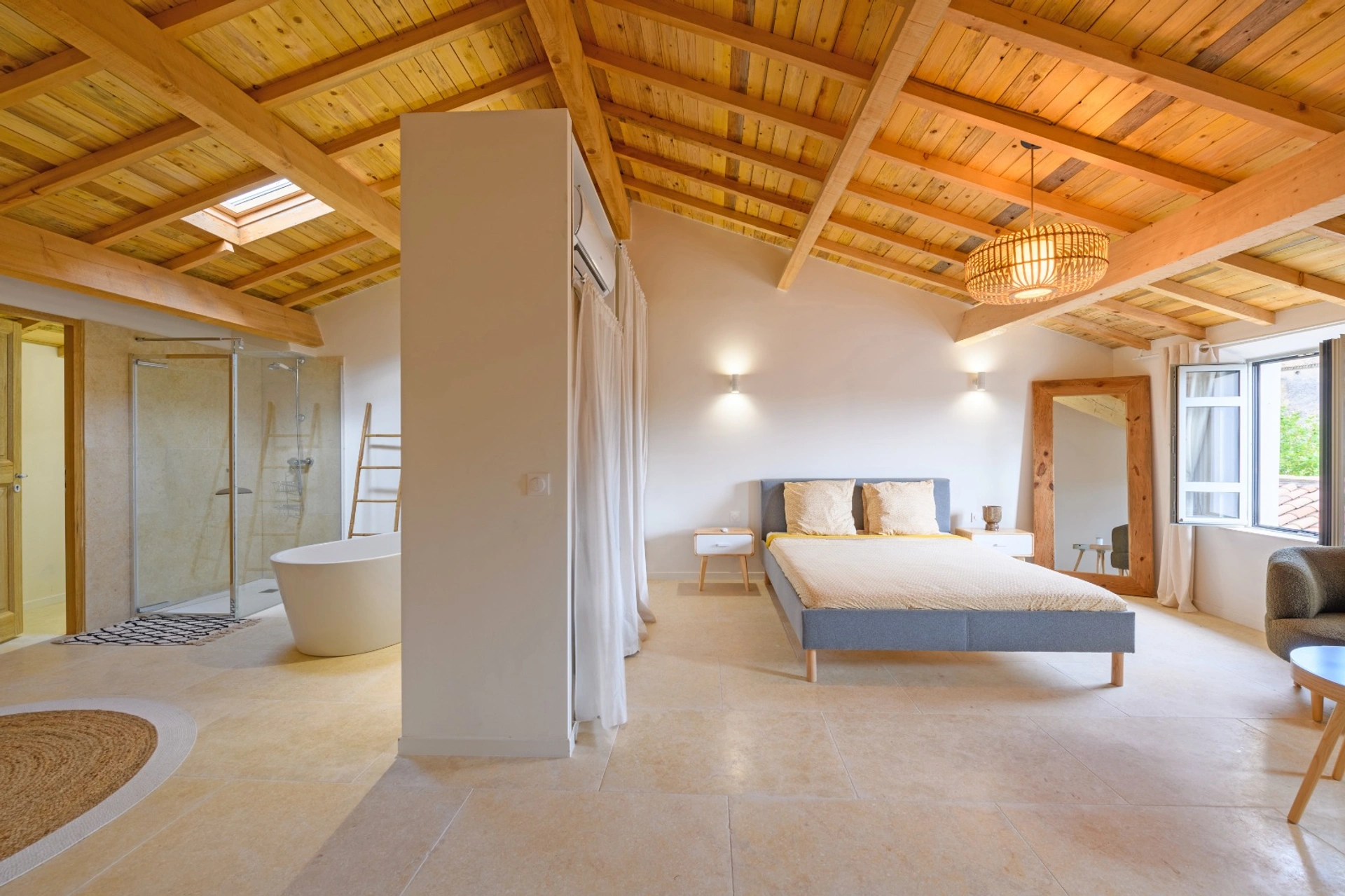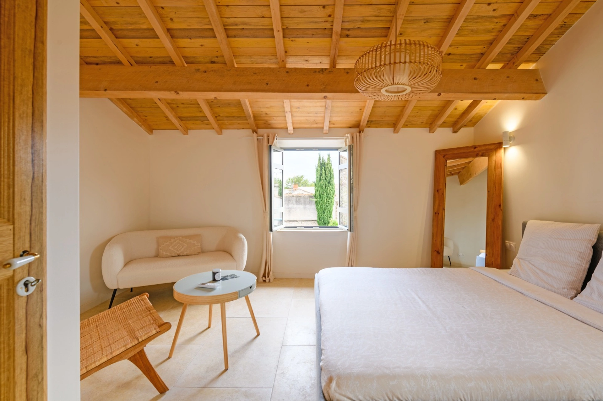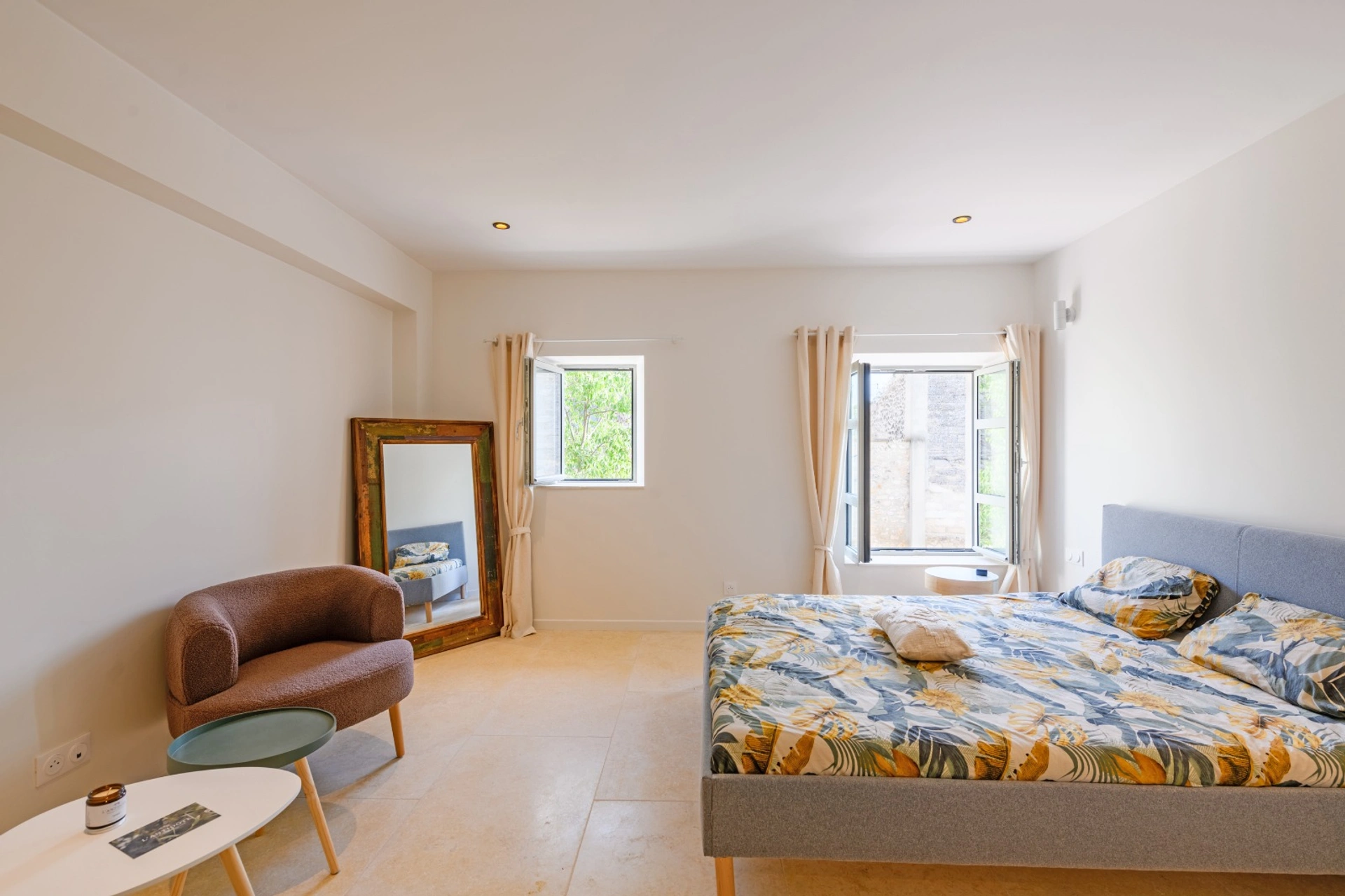 Entièrement rénovée avec des matériaux de qualité, cette propriété allie avec élégance charme authentique et confort moderne. Elle dispose de quatre vastes suites, chacune bénéficiant de sa propre salle de bain et de toilettes privatives. L'espace de vie, chaleureux et baigné de lumière, comprend une cuisine entièrement équipée donnant sur un patio ombragé, parfait pour partager des repas en plein air dans une ambiance sereine. Vous trouverez également un coin repas, un salon TV ainsi qu'un espace lecture, propices à la détente.