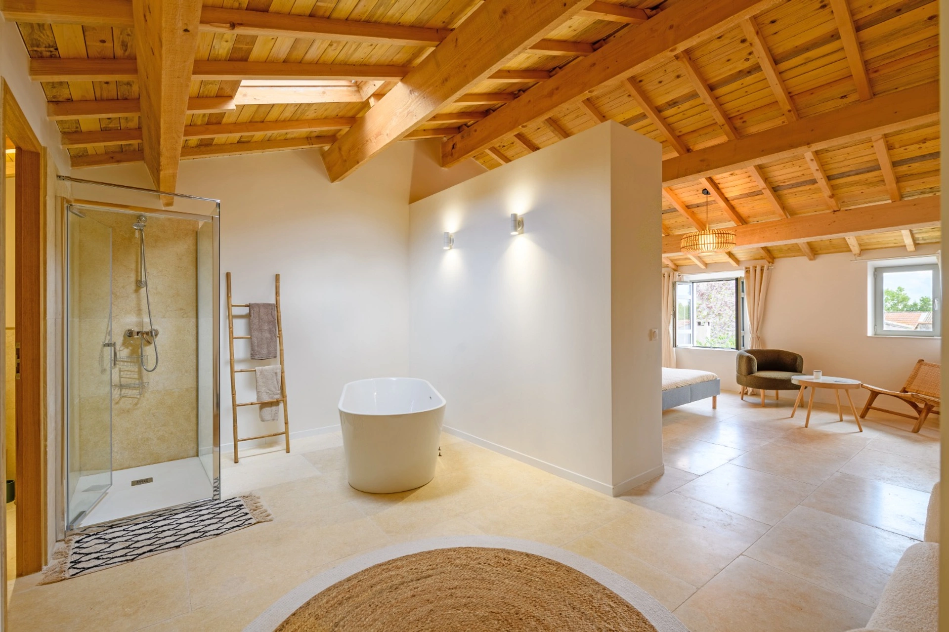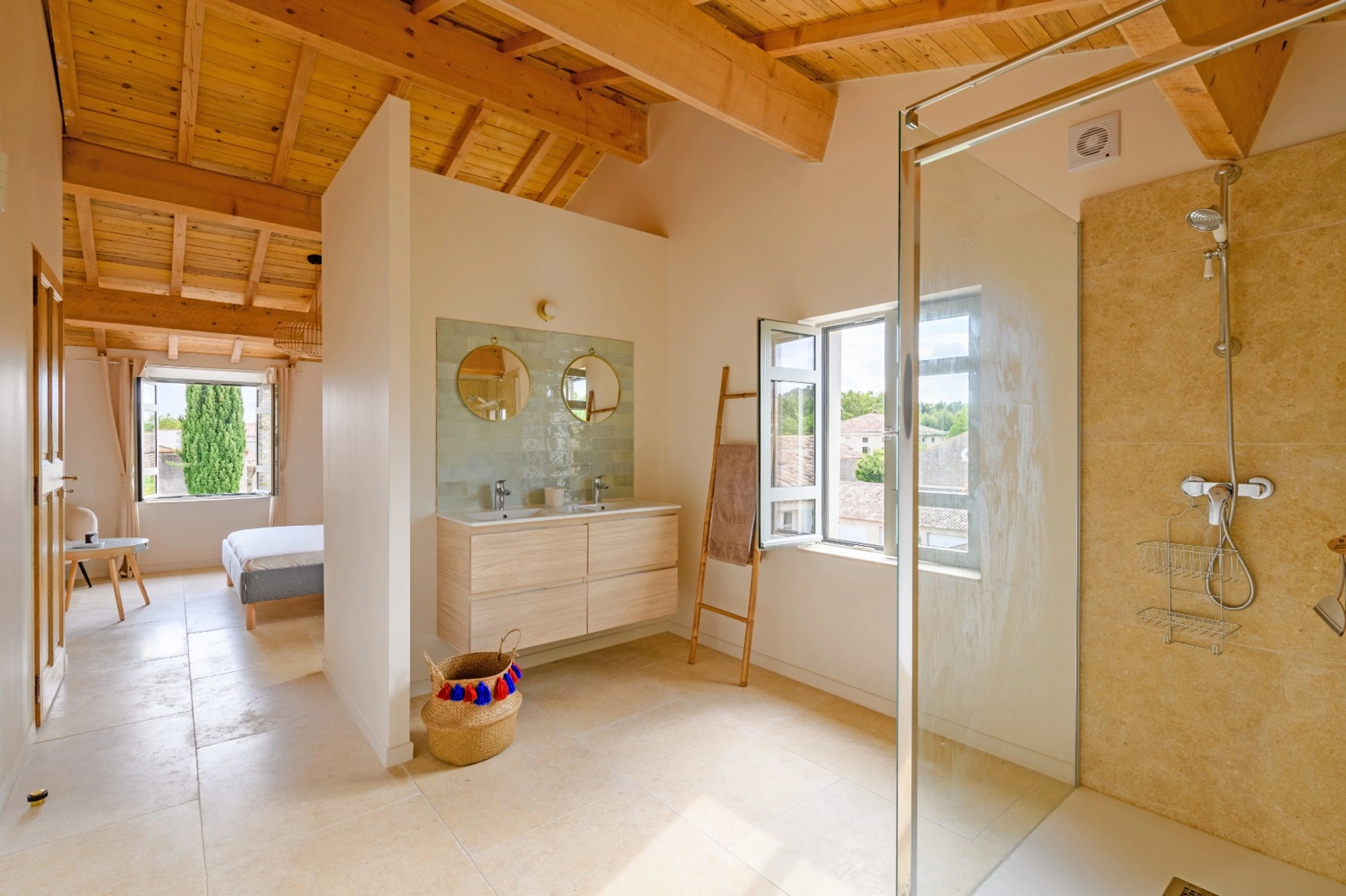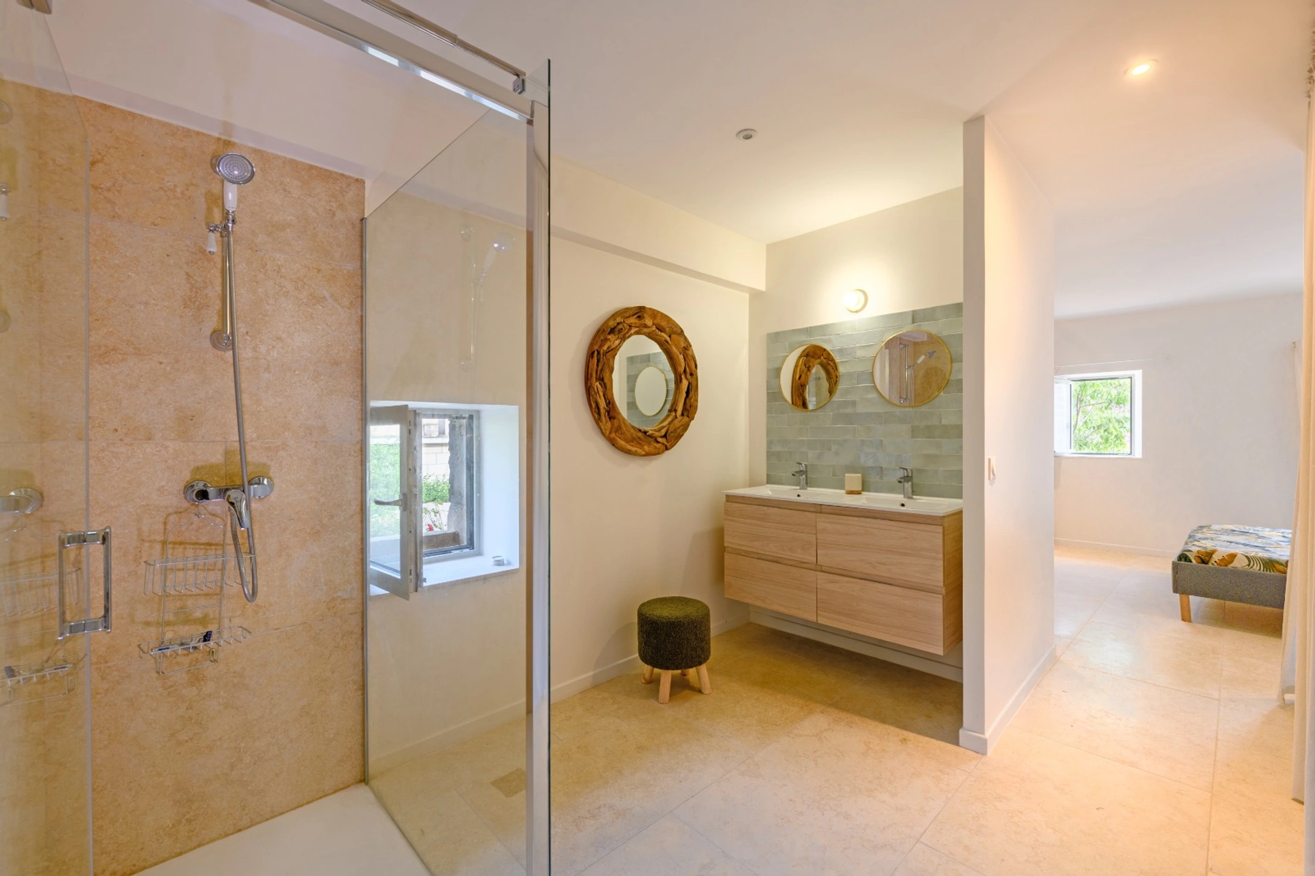 Entièrement rénovée avec des matériaux de qualité, cette propriété allie avec élégance charme authentique et confort moderne. Elle dispose de quatre vastes suites, chacune bénéficiant de sa propre salle de bain et de toilettes privatives. L'espace de vie, chaleureux et baigné de lumière, comprend une cuisine entièrement équipée donnant sur un patio ombragé, parfait pour partager des repas en plein air dans une ambiance sereine. Vous trouverez également un coin repas, un salon TV ainsi qu'un espace lecture, propices à la détente.