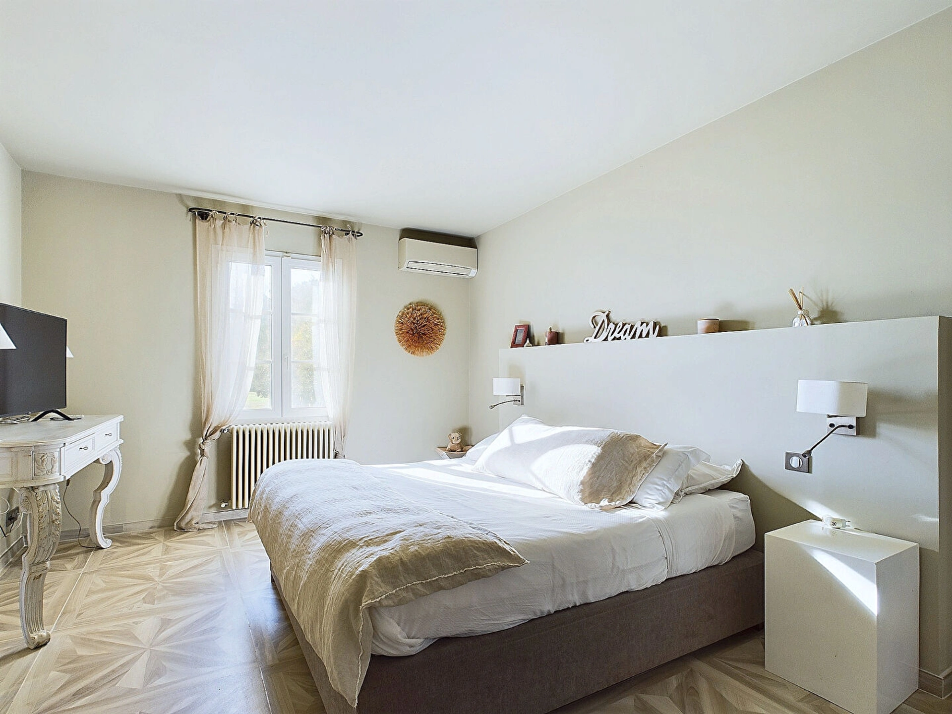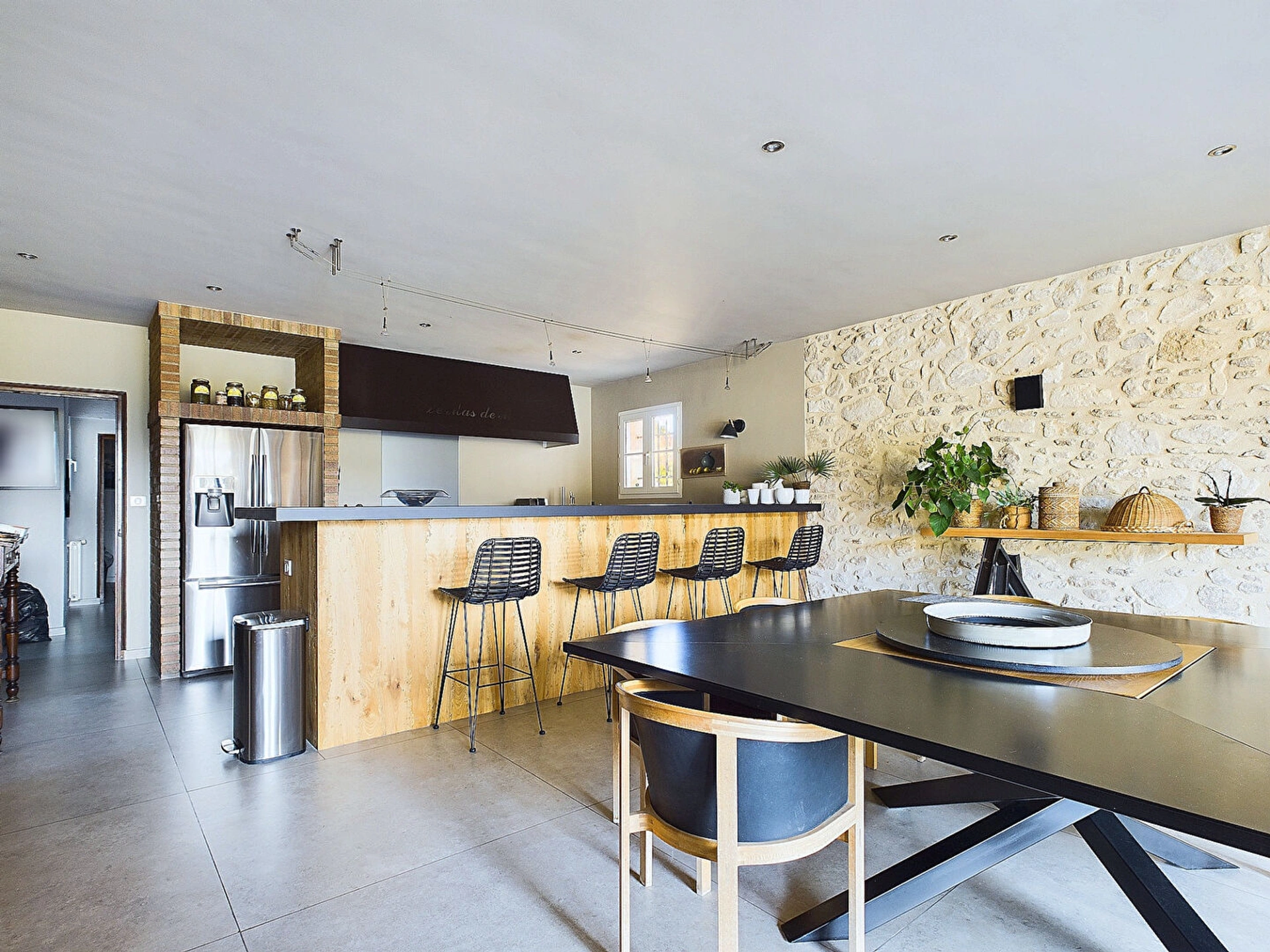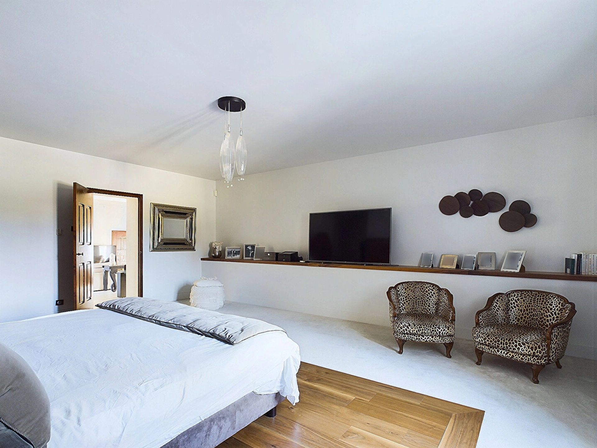 La maison comprend cinq chambres spacieuses, chacune dotée de sa propre salle de bain, garantissant ainsi confort et intimité pour tous les invités. Le vaste salon, baigné de lumière, combine élégance et chaleur, créant un espace convivial pour partager de précieux moments en famille ou entre amis. La cuisine ouverte, parfaitement équipée, s'accompagne d'un espace repas chaleureux, avec un accès direct à la piscine et au pool house.