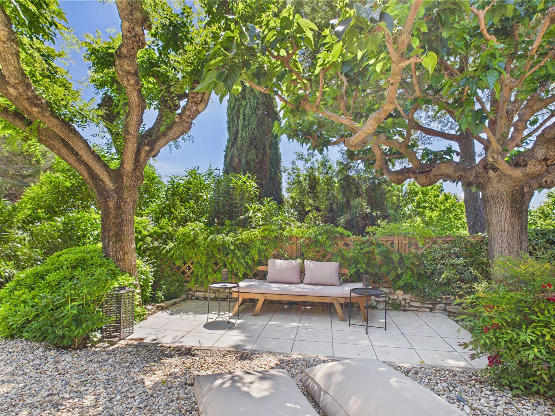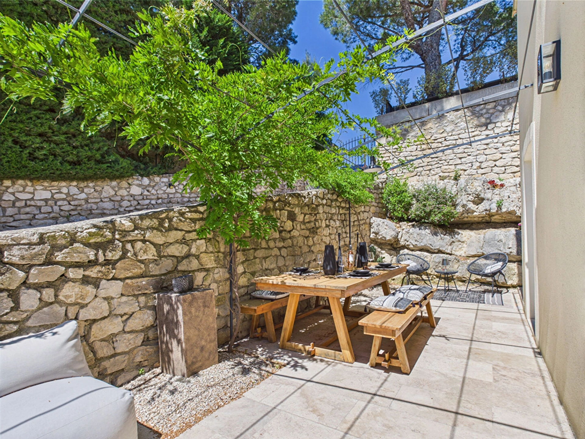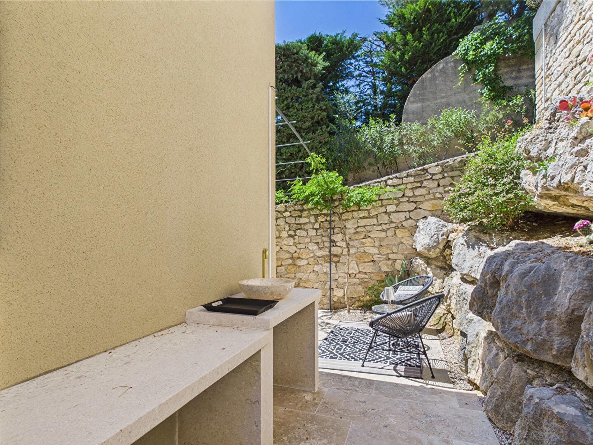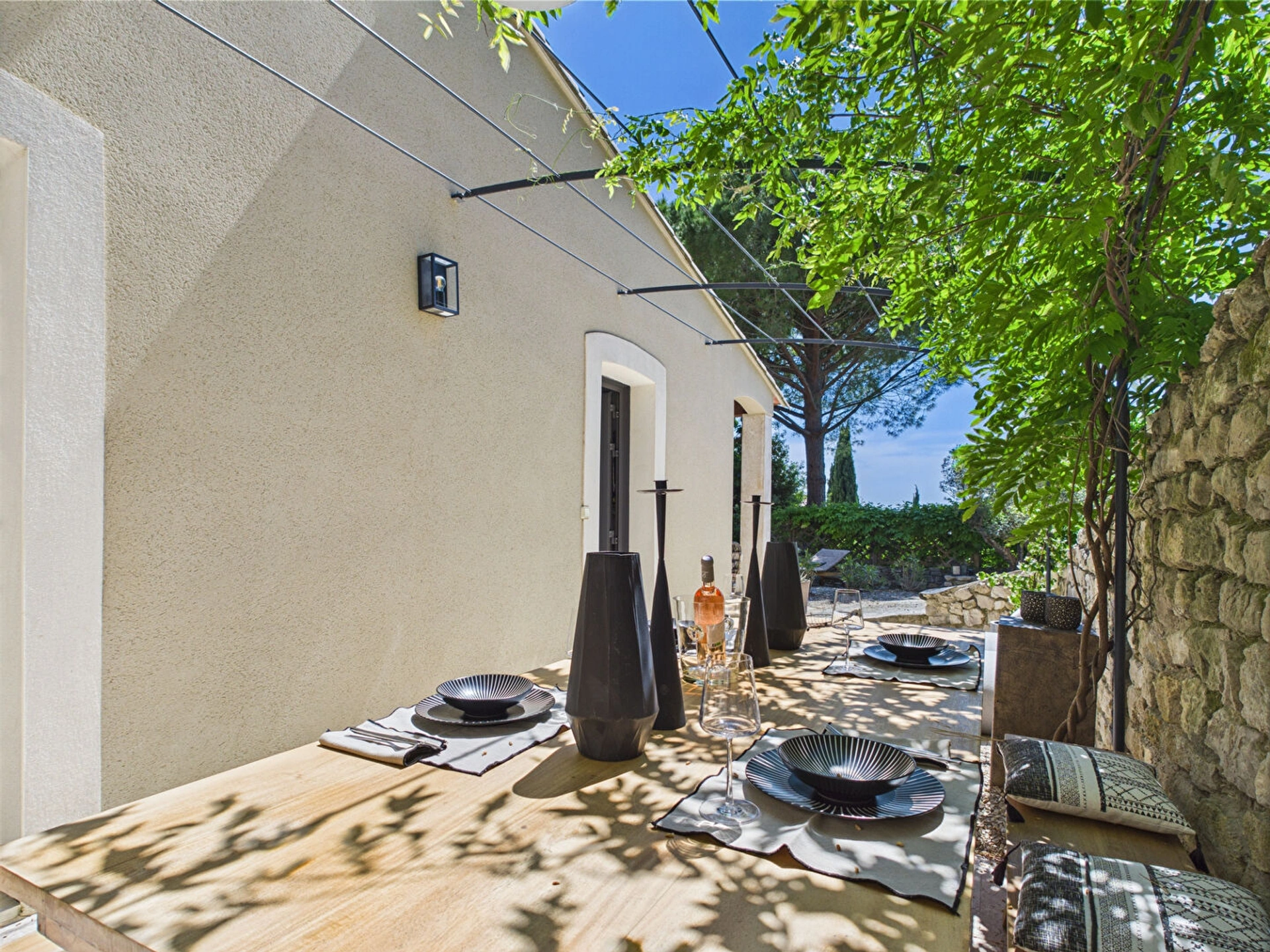A l'extérieur, la terrasse ombragée vous permettra de profiter pleinement du climat provençal, que ce soit pour un petit-déjeuner au lever du soleil, un moment de lecture à l'ombre ou un apéritif face aux collines au coucher du soleil.