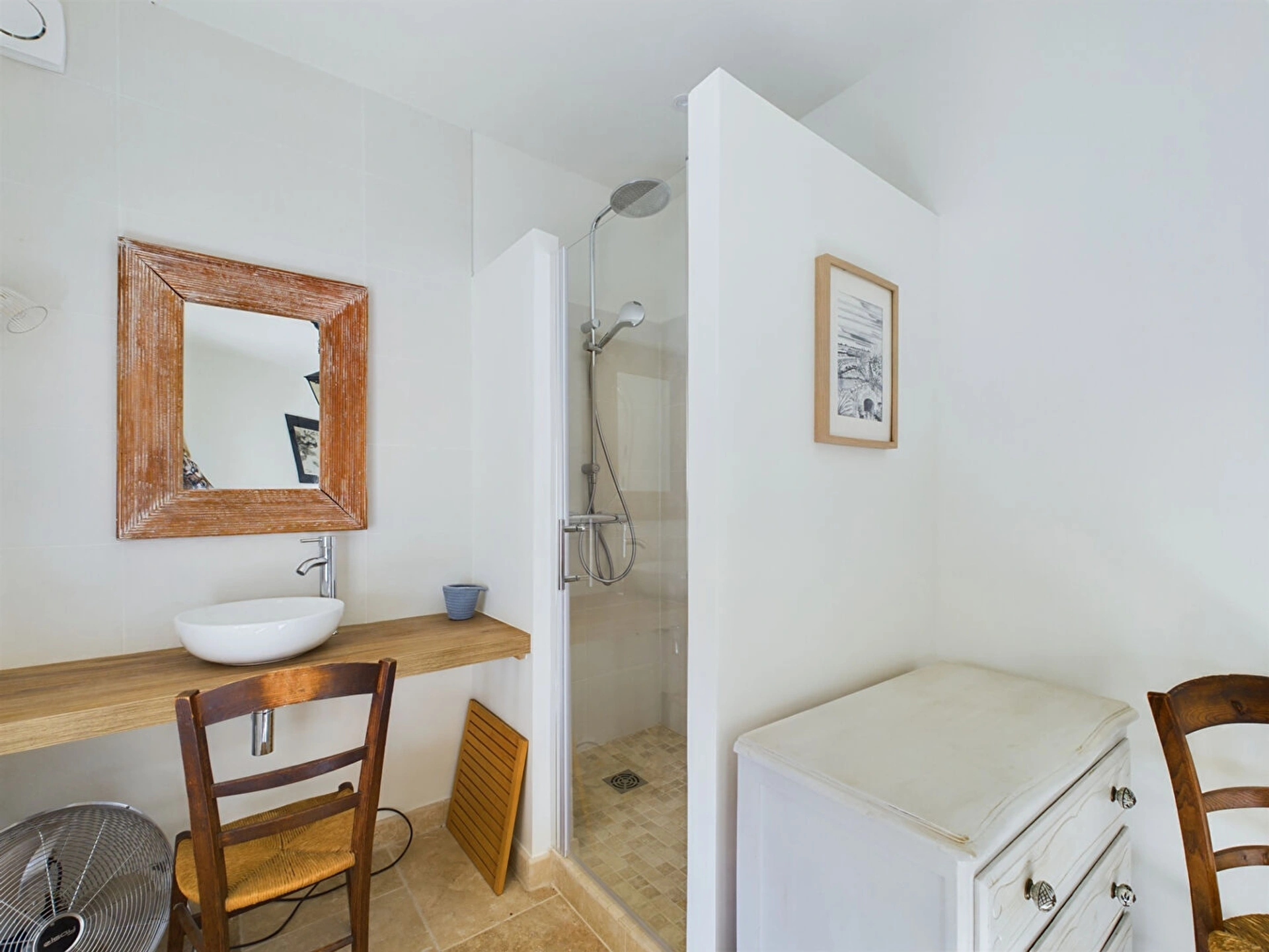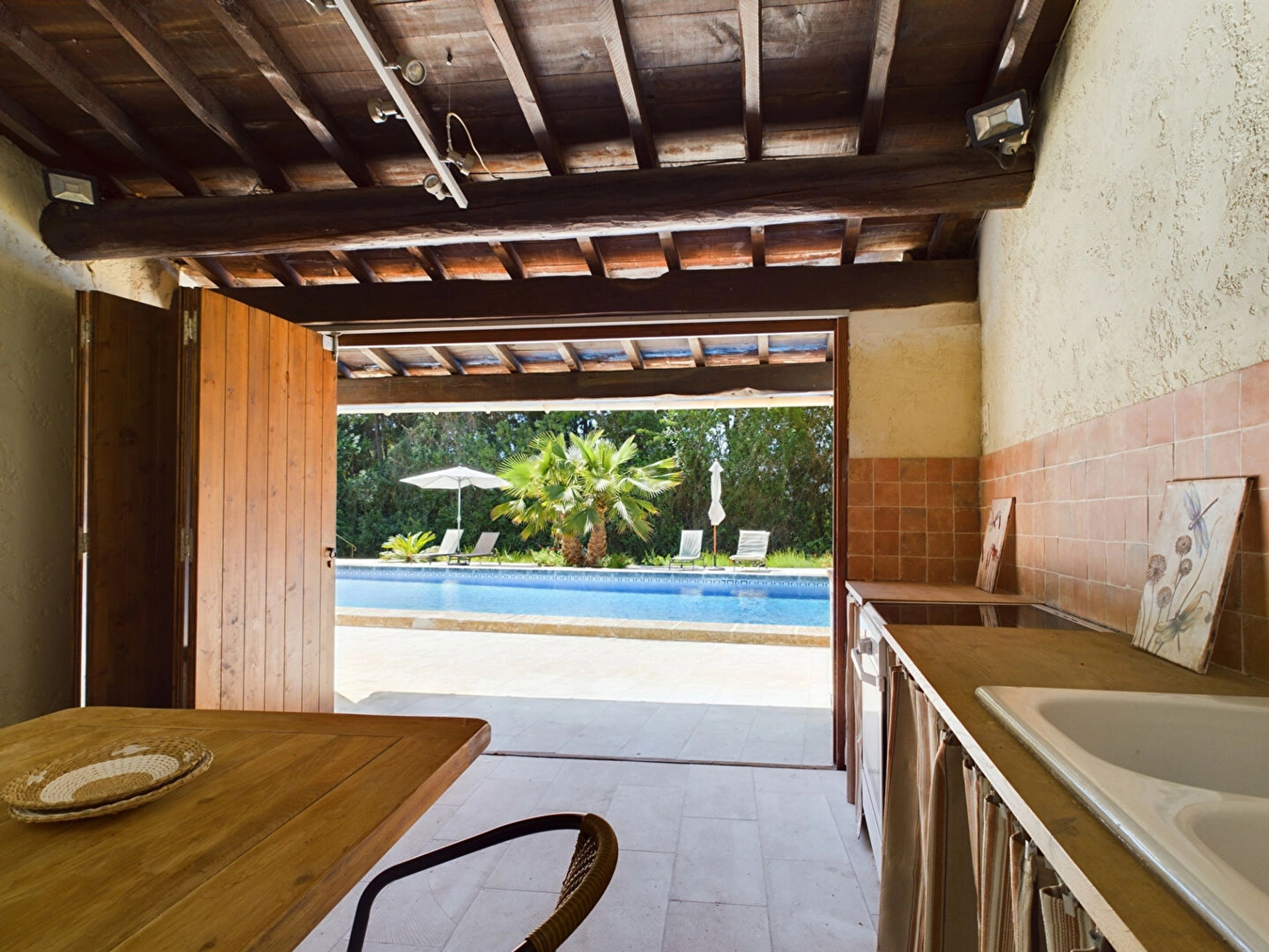 Une dépendance abrite une chambre supplémentaire avec salle d'eau, offrant un accès à une terrasse couverte aménagée pour accueillir confortablement 12 à 14 personnes autour d'une grande table en bois.