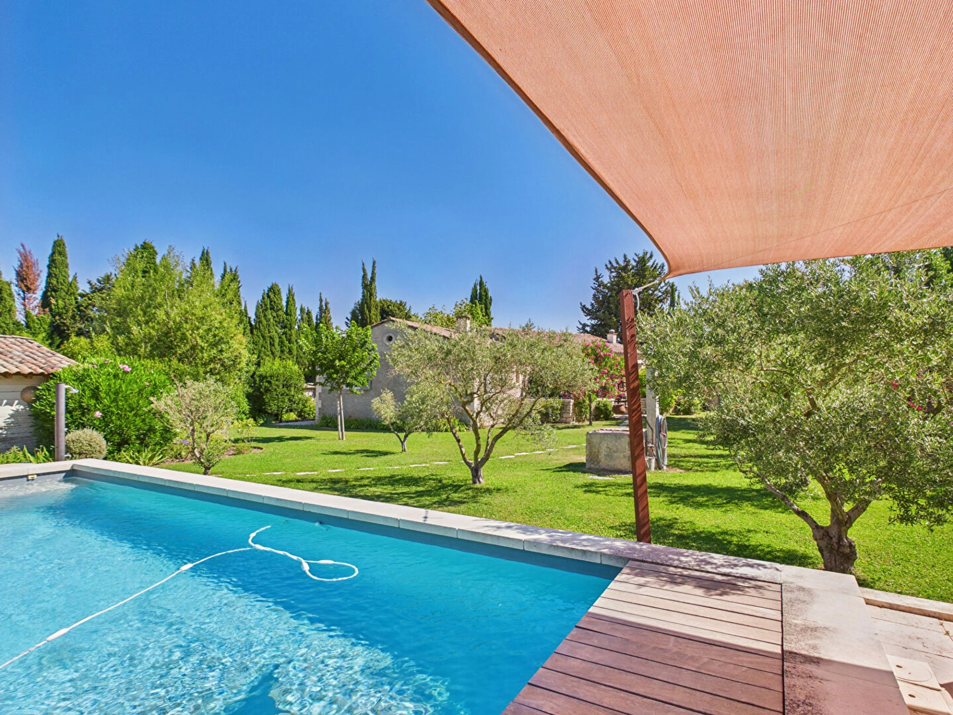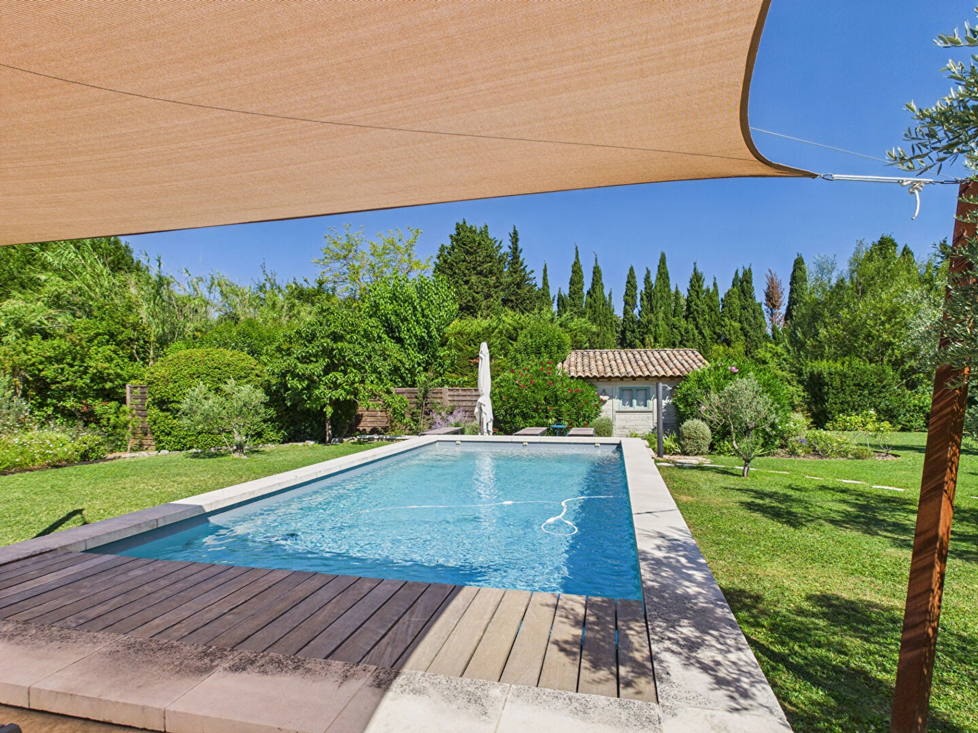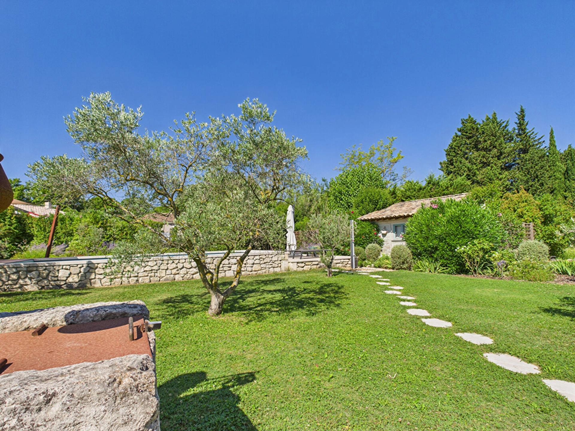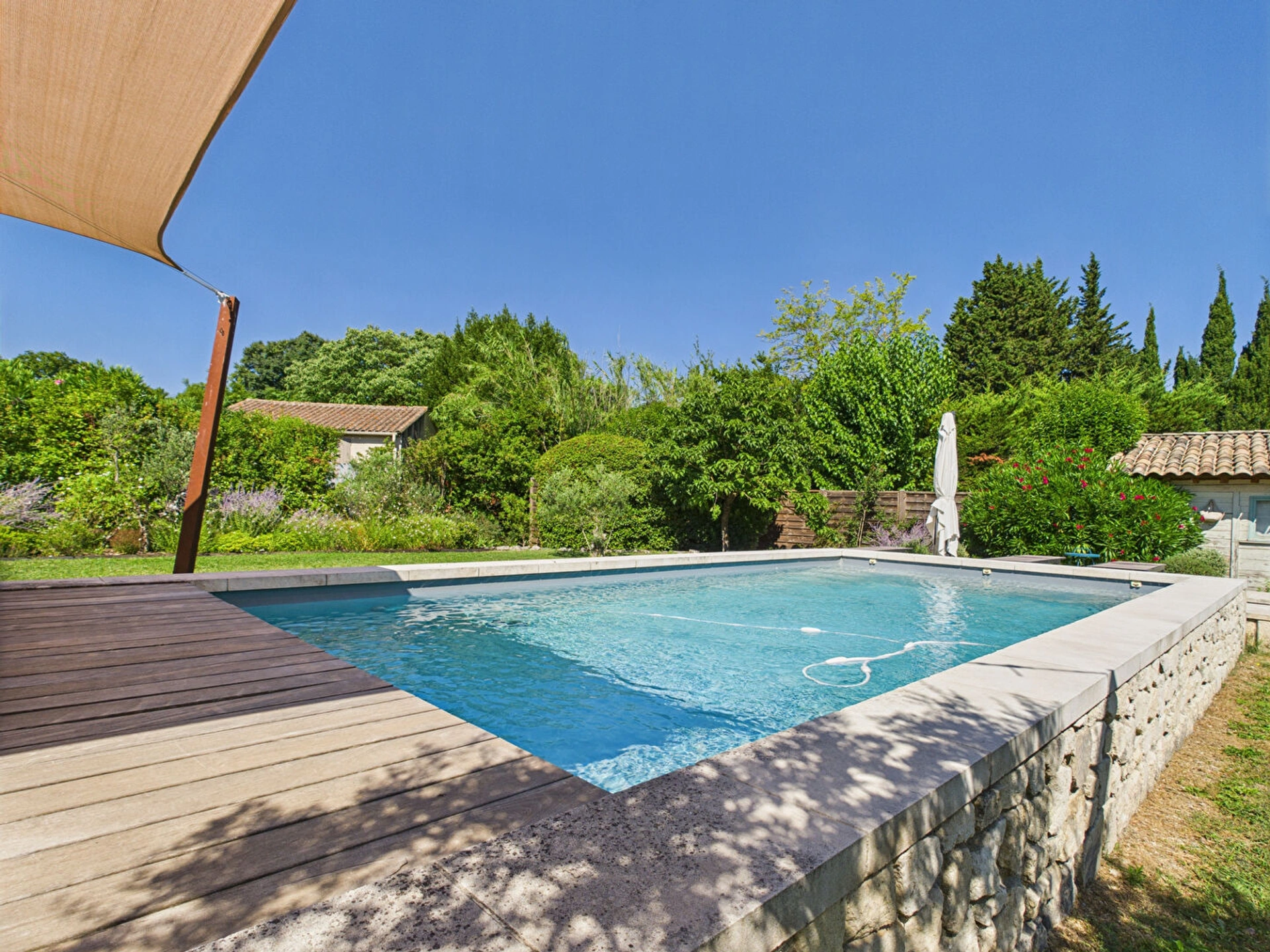 Le jardin de 1 800 m² constitue un véritable écrin de sérénité, propice à la détente et aux moments de convivialité en extérieur. Il abrite une piscine de 9 x 4 m, sécurisée par un volet roulant pour assurer la tranquillité des parents. Chauffée d'avril à juin et de septembre à octobre, elle permet de profiter des joies de la baignade même en dehors de la haute saison.