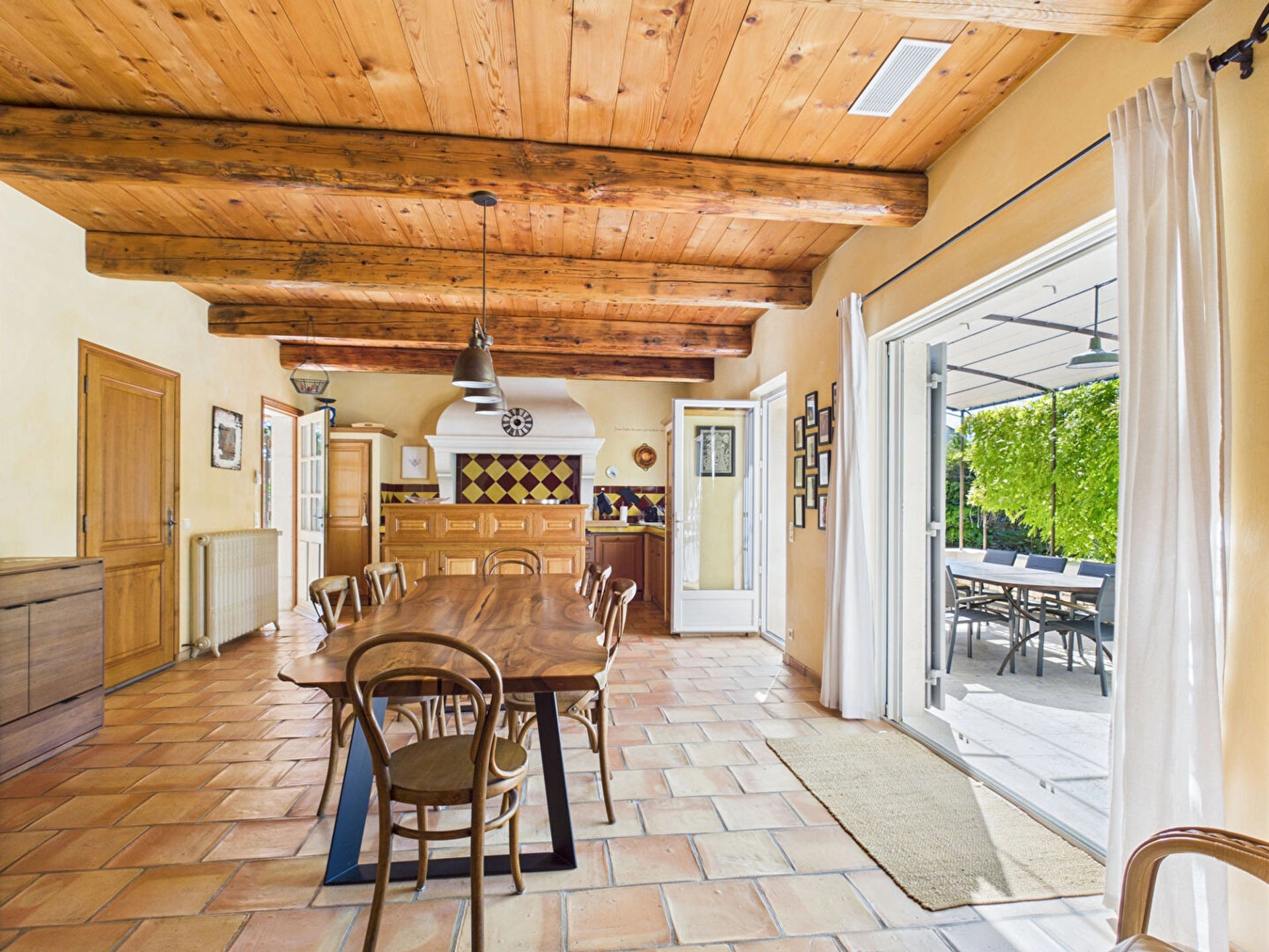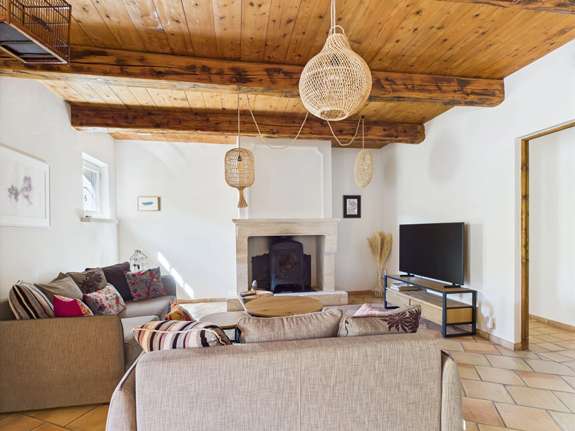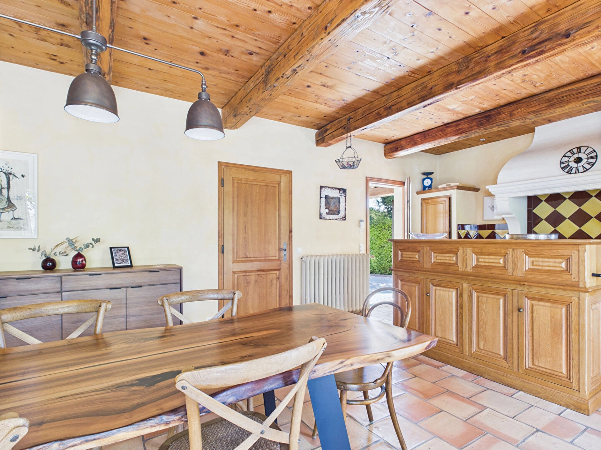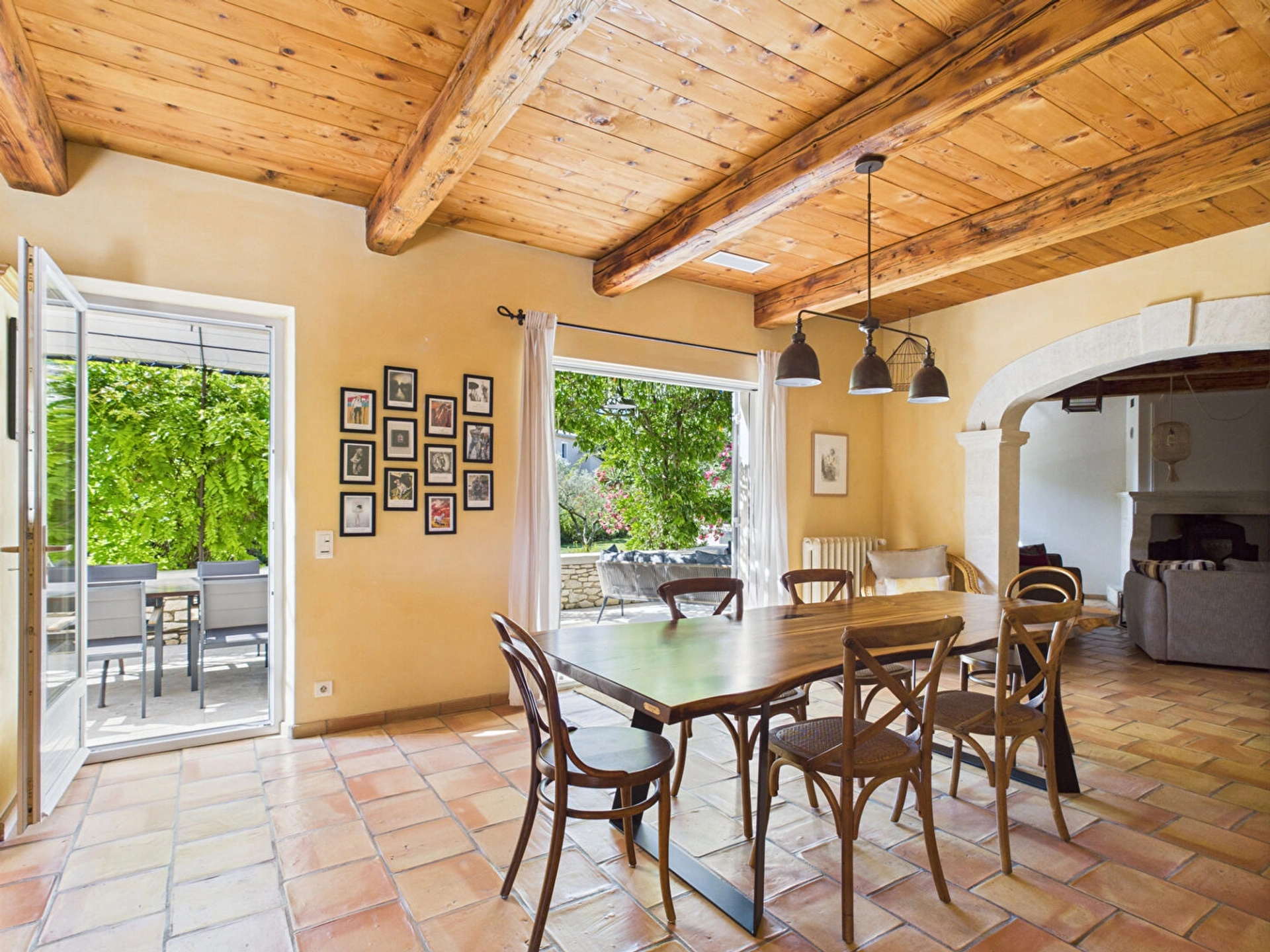 L'espace de vie, à la fois lumineux et accueillant, se compose d'un salon chaleureux, d'une salle à manger conviviale et d'une cuisine ouverte entièrement équipée, idéale pour concocter de délicieux repas. De grandes baies vitrées laissent entrer une belle lumière naturelle et offrent une vue agréable sur le jardin.