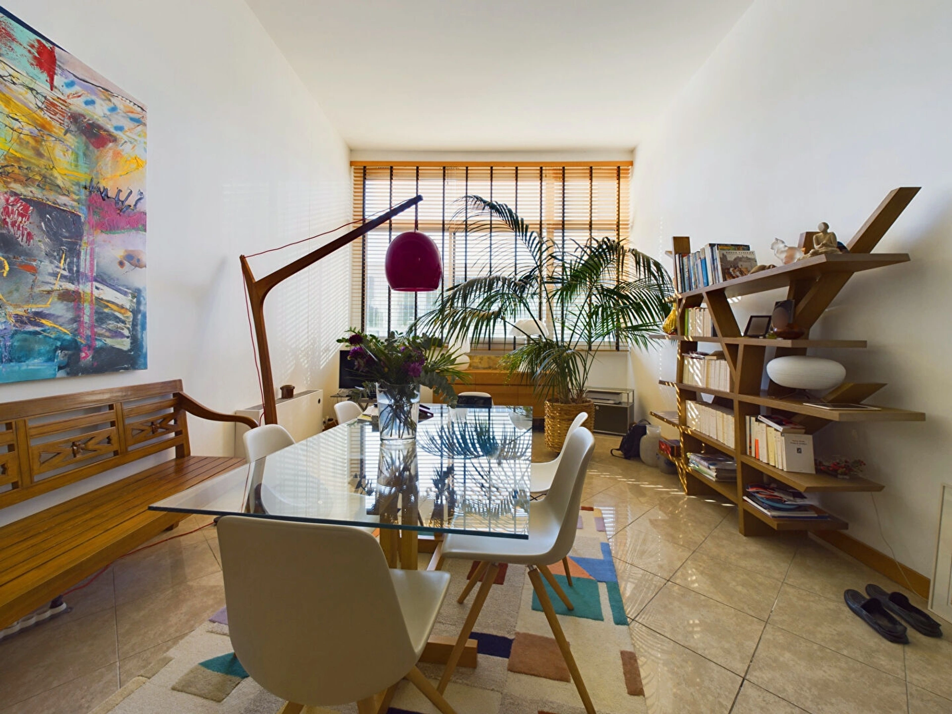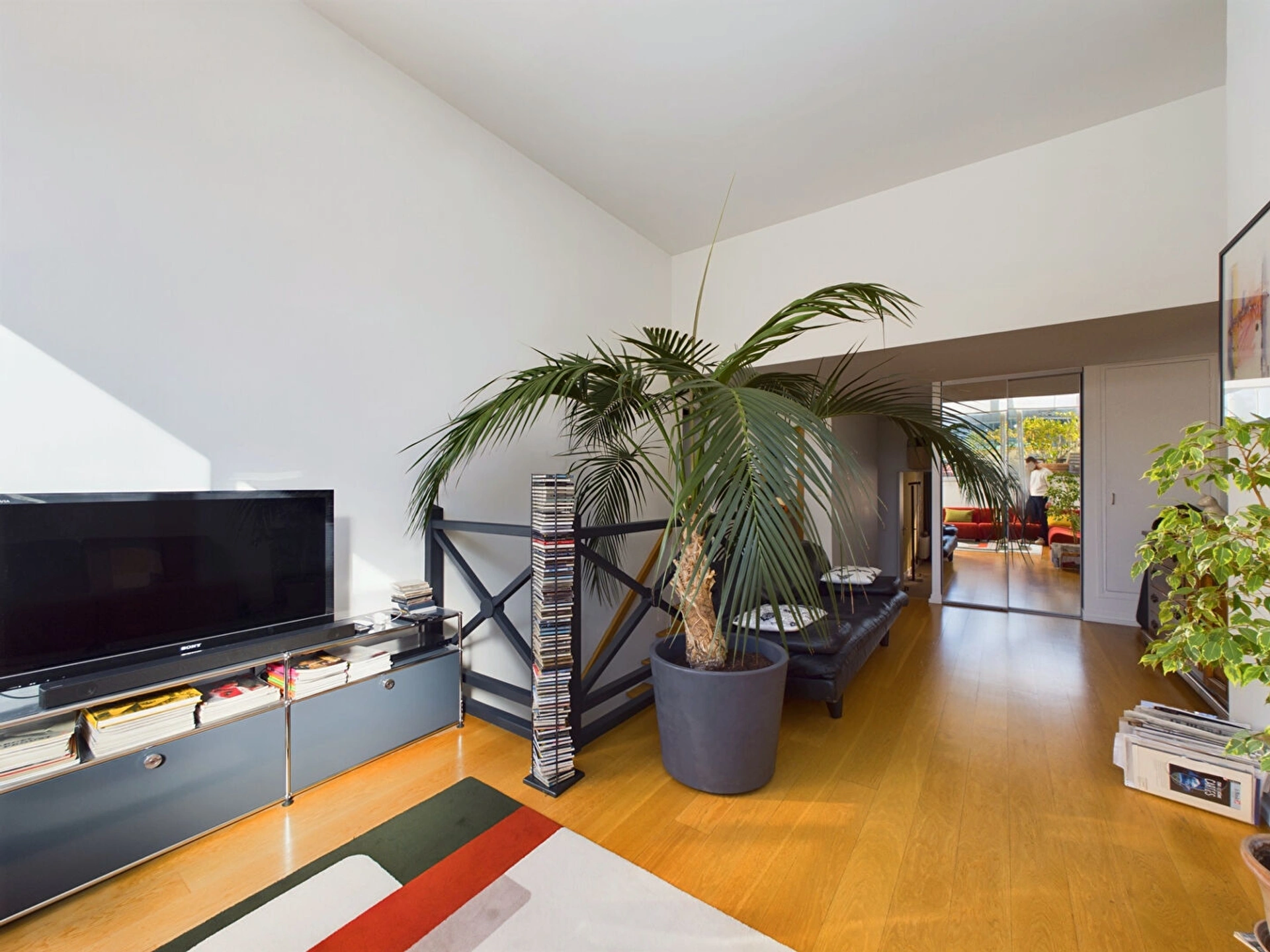 Aux derniers étages de l'immeuble (5ème et 6ème), accessible par ascenseur, cet appartement de 122m² pondérés (115.92m² carrez et pondération de la terrasse au tiers de sa surface), se compose au premier niveau d'une entrée avec rangements, une cuisine équipée ouverte sur un grand séjour, le tout pour une surface de près de 39m², avec une très belle verrière exposée sud ouest et une hauteur sous plafond de 3.85m.