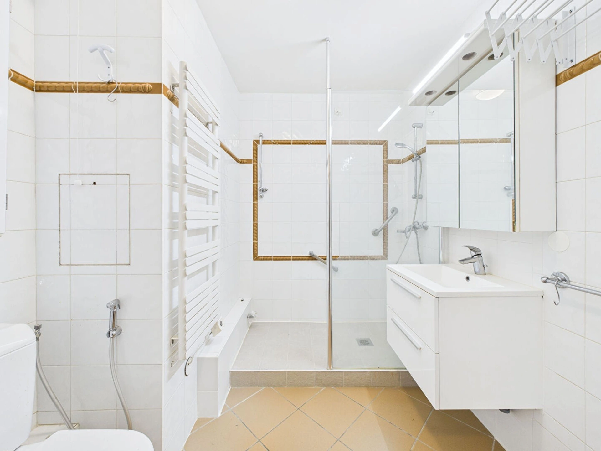 Le bien se compose comme suit : une entrée desservant, à gauche un séjour de 26m² exposé sud/est avec vue sur le jardin de la résidence, à droite une première chambre de 11m², une cuisine indépendante aménagée et équipée, une salle d'eau avec WC, une deuxième chambre de 12.5m², une deuxième salle d'eau avec WC et de nombreux rangements dans tous l'appartement.