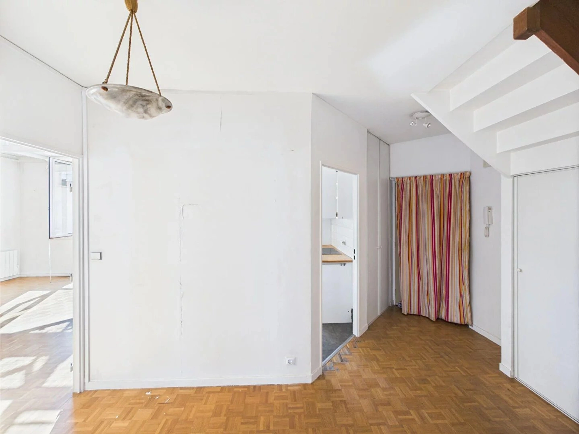 Une entrée avec rangements dessert un beau séjour cathédrale (25 m²) ainsi qu'une cuisine aménagée et équipée semi-ouverte (9,5 m²). Entièrement cloisonné, cet espace s'ouvrira facilement pour laisser place à une grande pièce à vivre d'environ 45m². Ce niveau propose également deux pièces indépendantes, aujourd'hui aménagées en bureau et pièce d'appoint, toutes deux avec accès direct à une terrasse de 17 m² sans vis-à-vis et avec une vue époustouflante sur tout Puteaux et la Défense. Ces espaces offrent un choix important de possibilité : salle de jeux, cuisine indépendante donnant à la fois sur salle à manger (si cuisine existante supprimée) et sur la terrasse pour des repas en famille au soleil lors des beaux jours d'été. Un WC indépendant et une salle de bains avec espace buanderie complète ce niveau.