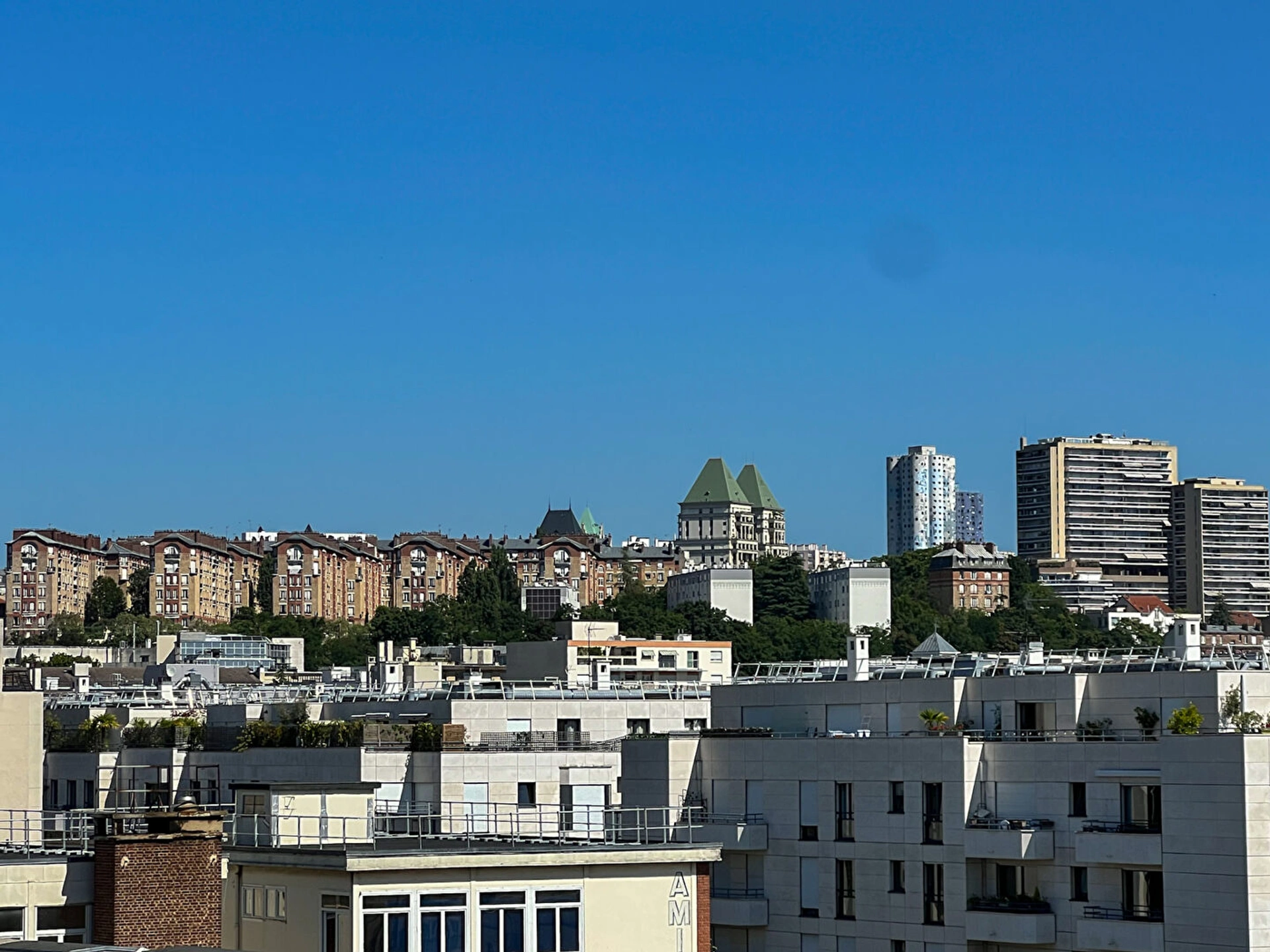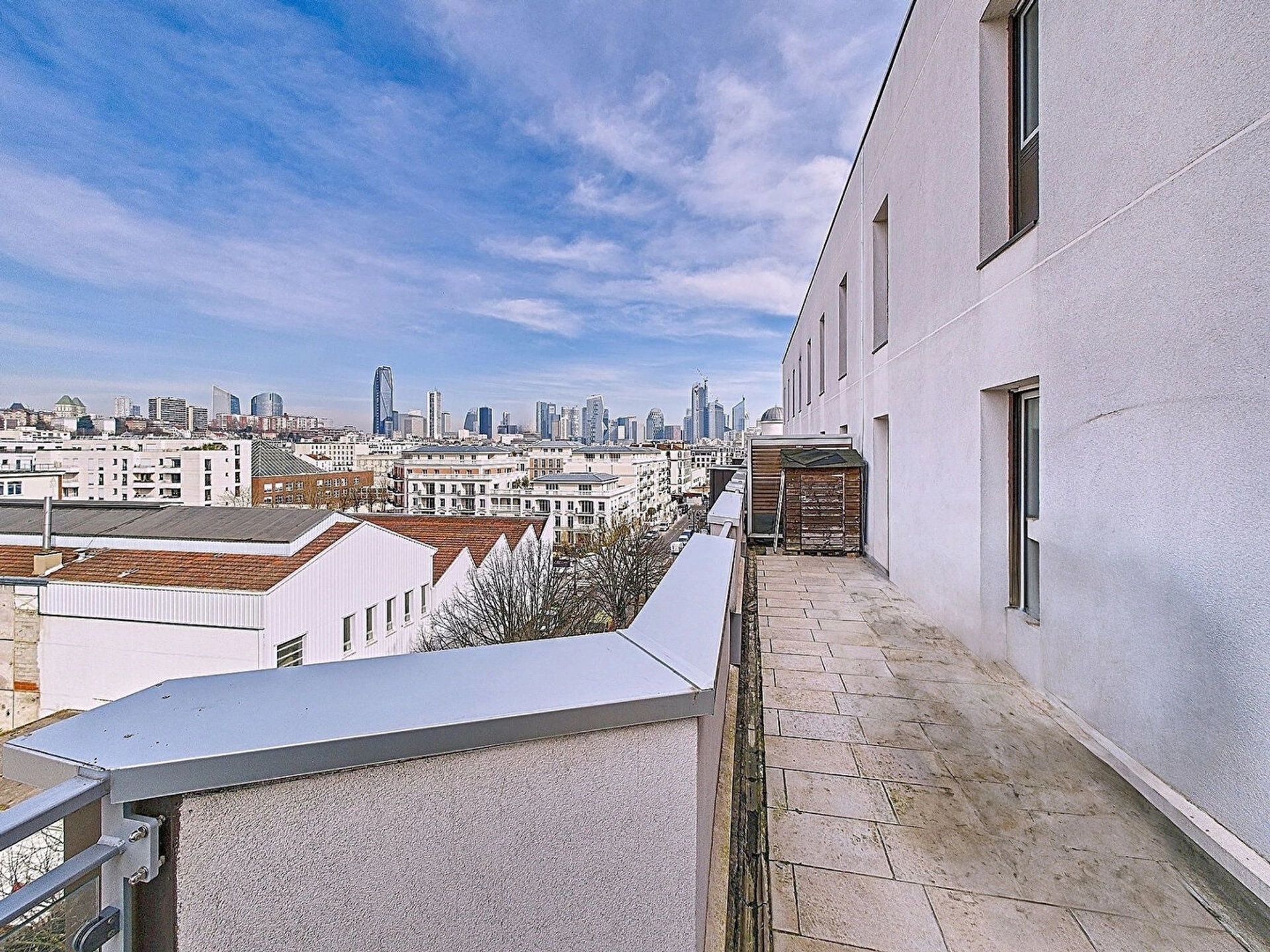 Au sixième étage : Une entrée avec placard desservant une cuisine semi-ouverte aménagée et équipée (9.5m²), un séjour "cathédrale" (25m²), un espace nuit comprenant 1 toilette indépendant, une salle de bain, 2 chambres (10m² chacune) donnant accès à une terrasse (17m²) exposée ouest avec une belle vue sur tout Puteaux et La Défense.