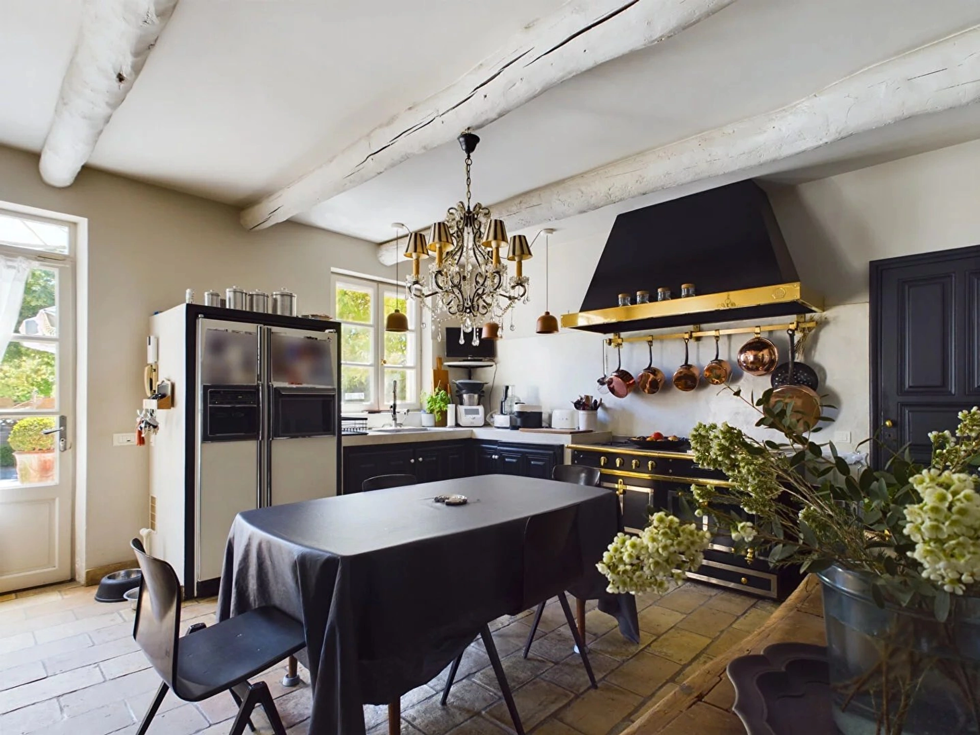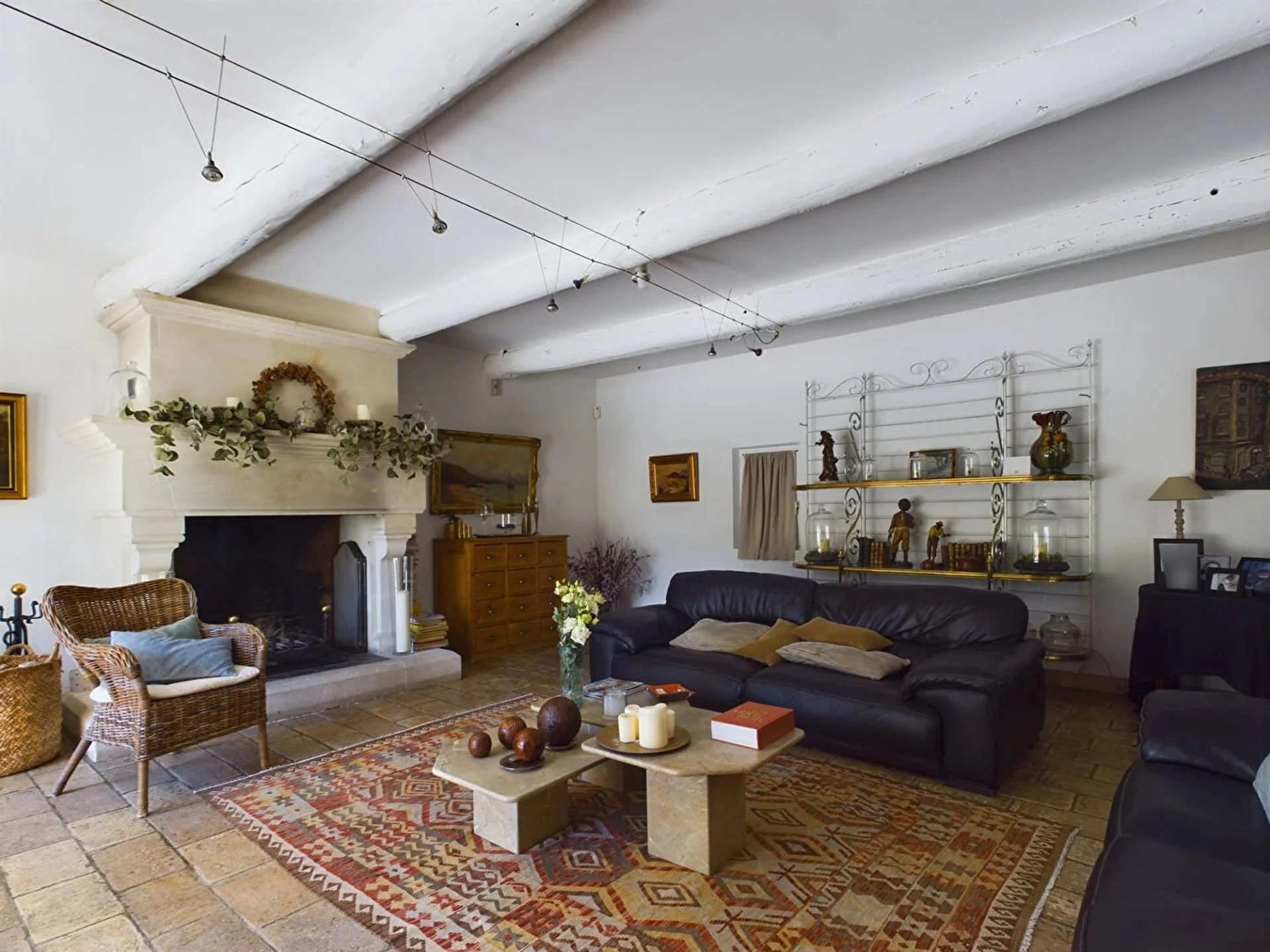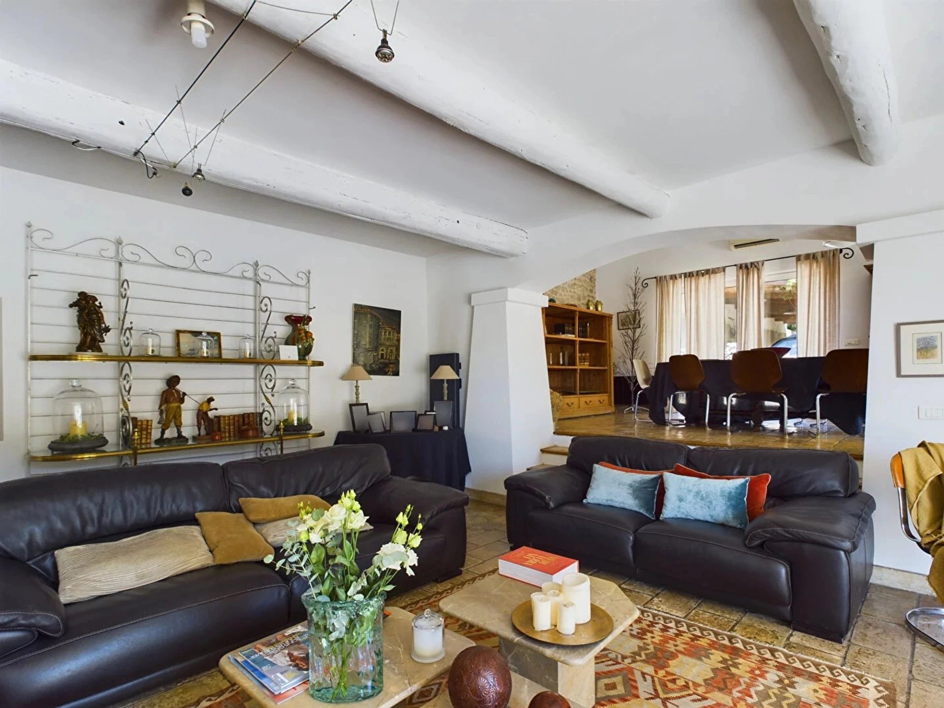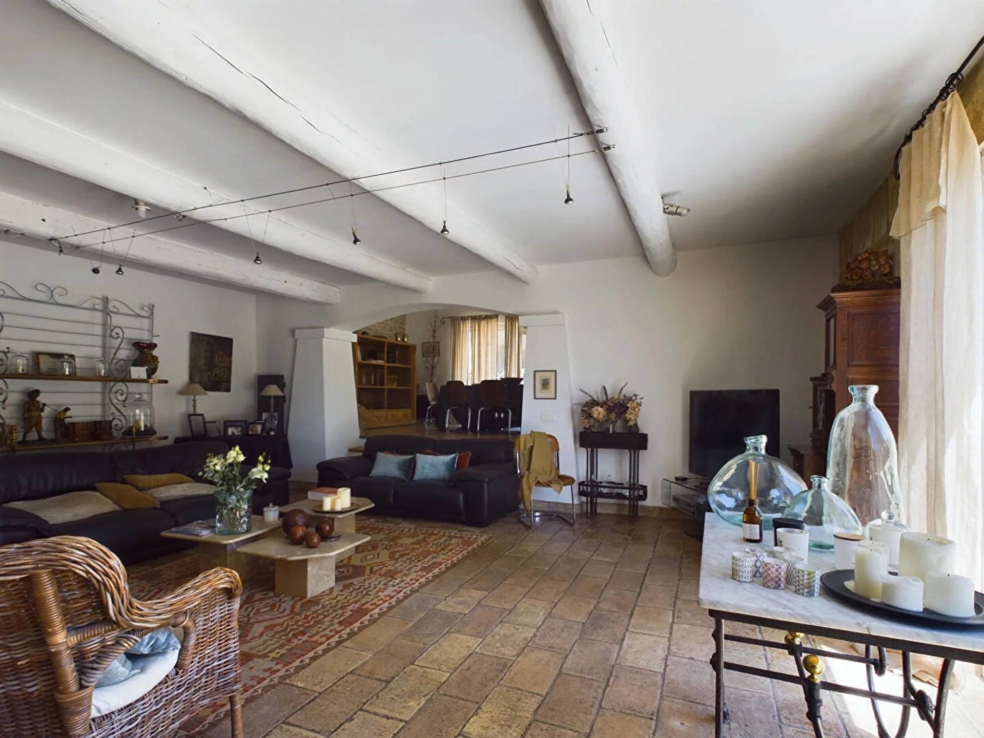 A l'intérieur, le mas se compose d'une cuisine avec une arrière cuisine, cellier et un wc d'invité. Vous avez ensuite un grand double séjour avec cheminée fonctionnelle, espace salle à manger et espace salon.