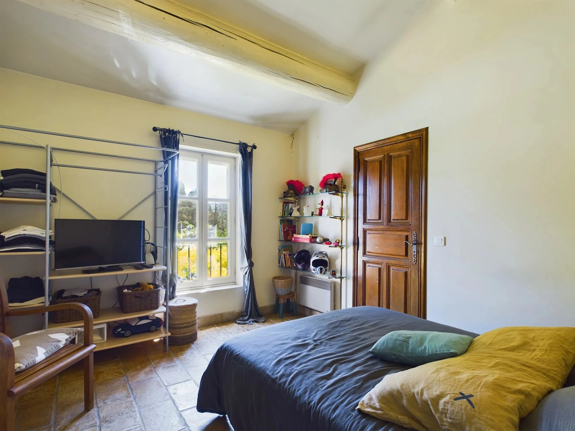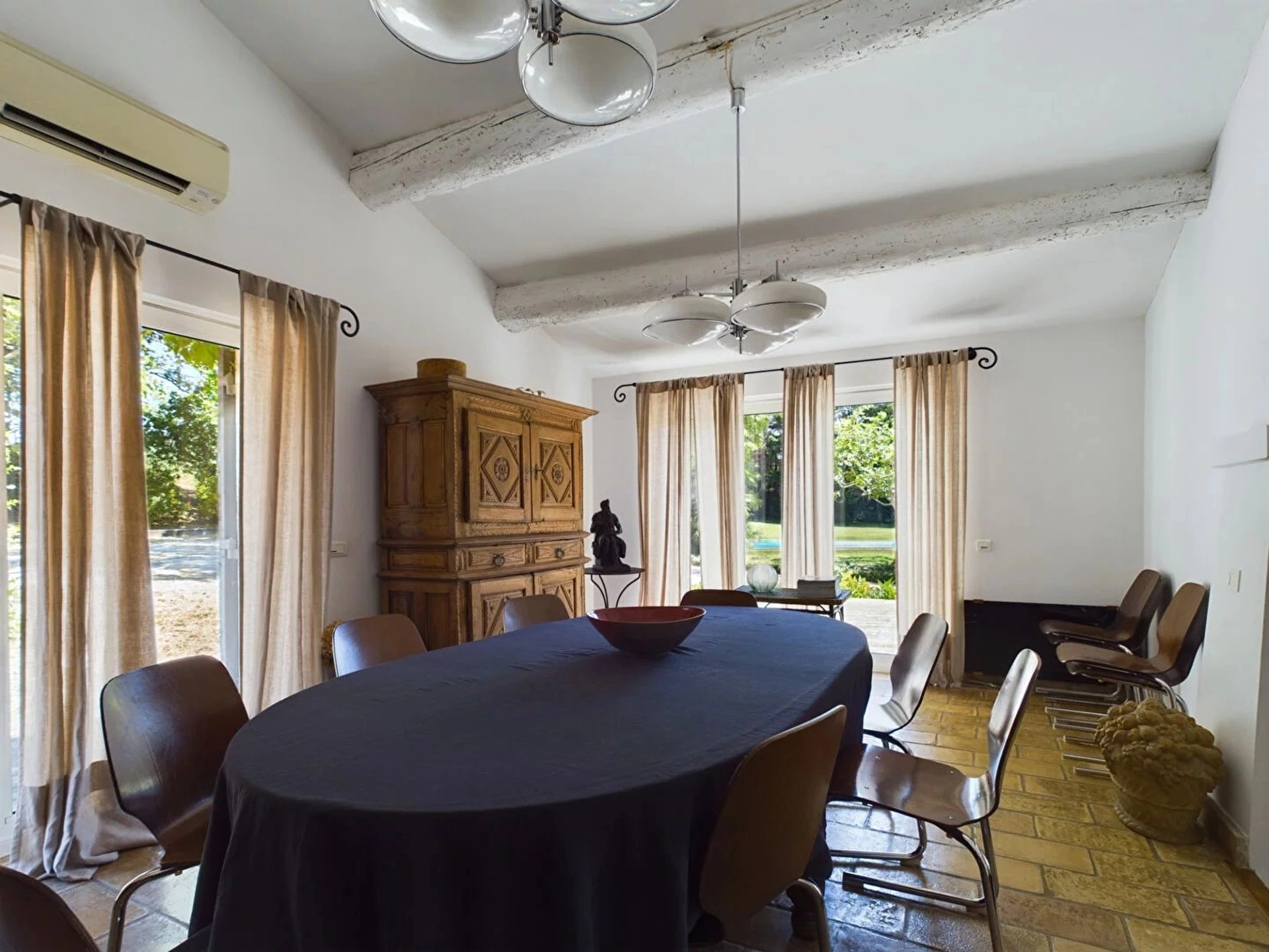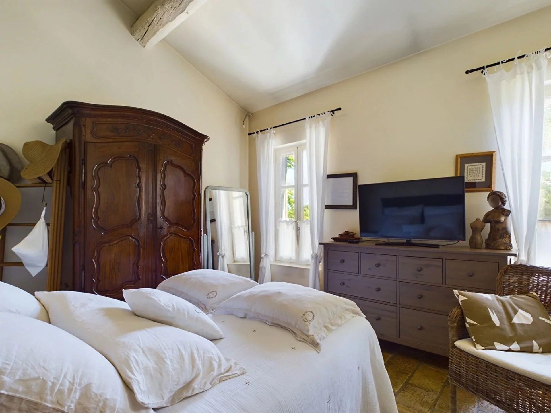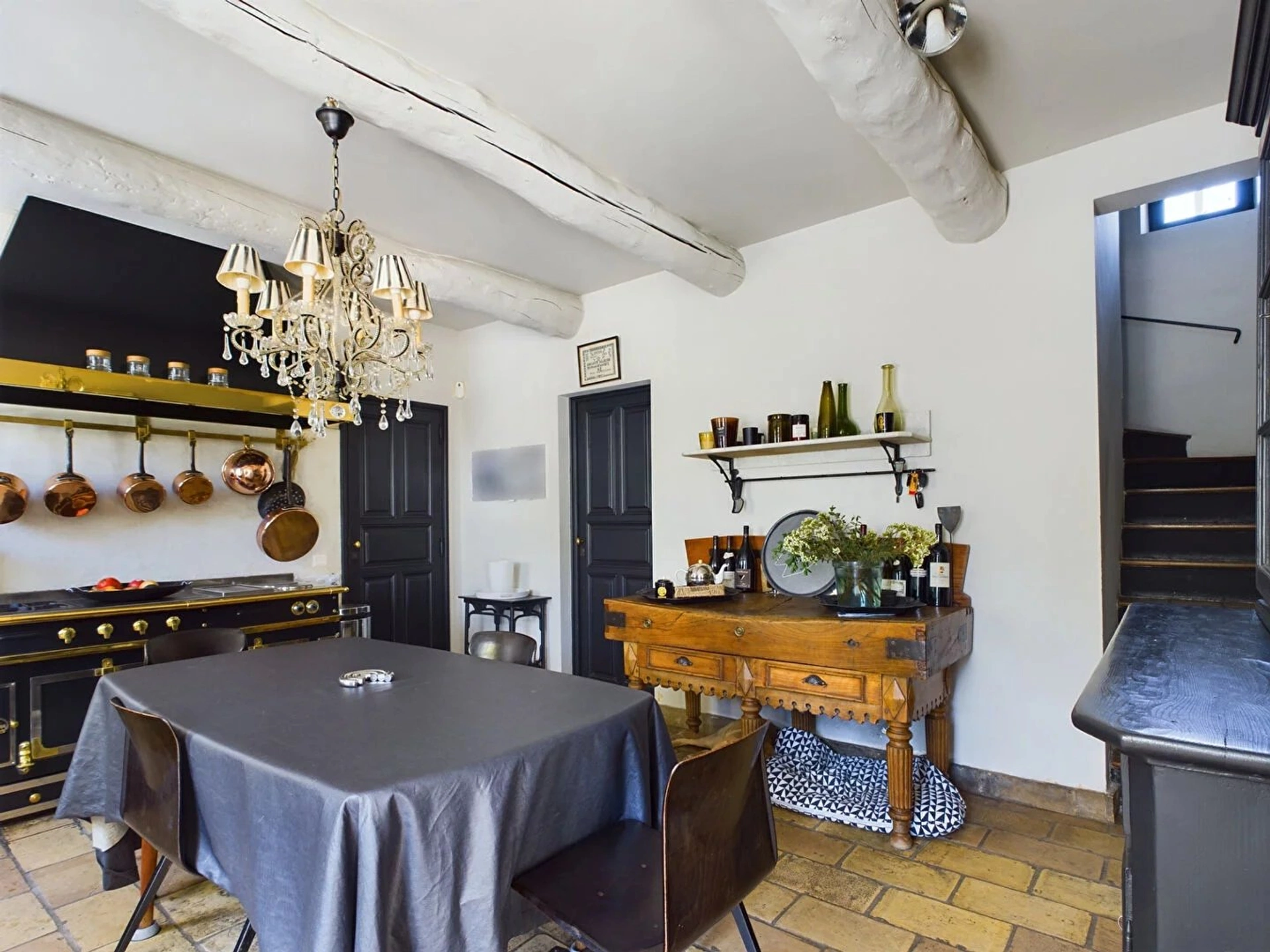 A l'intérieur, le mas se compose d'une cuisine avec une arrière cuisine, cellier et un wc d'invité. Vous avez ensuite un grand double séjour avec cheminée fonctionnelle, espace salle à manger et espace salon.