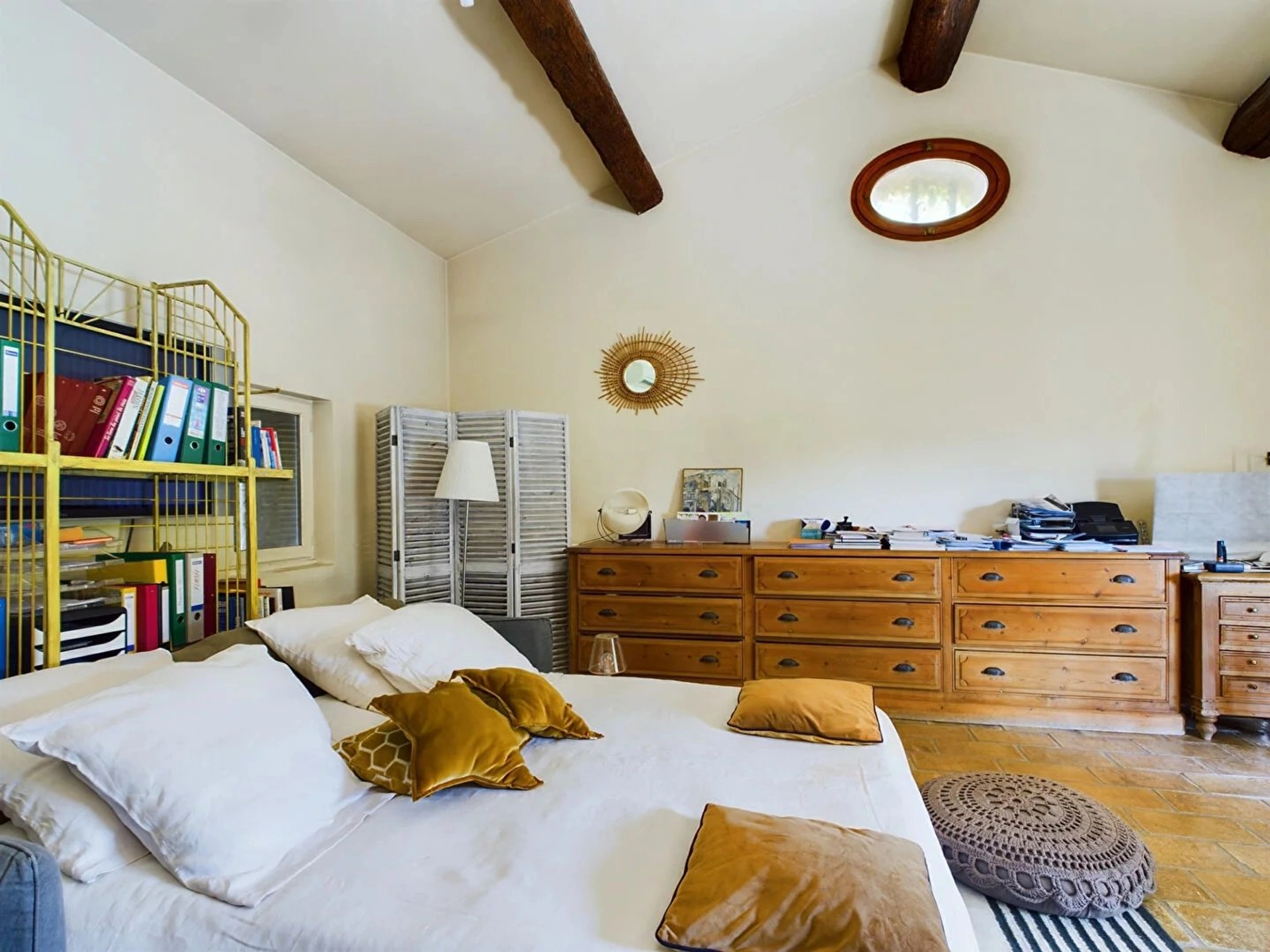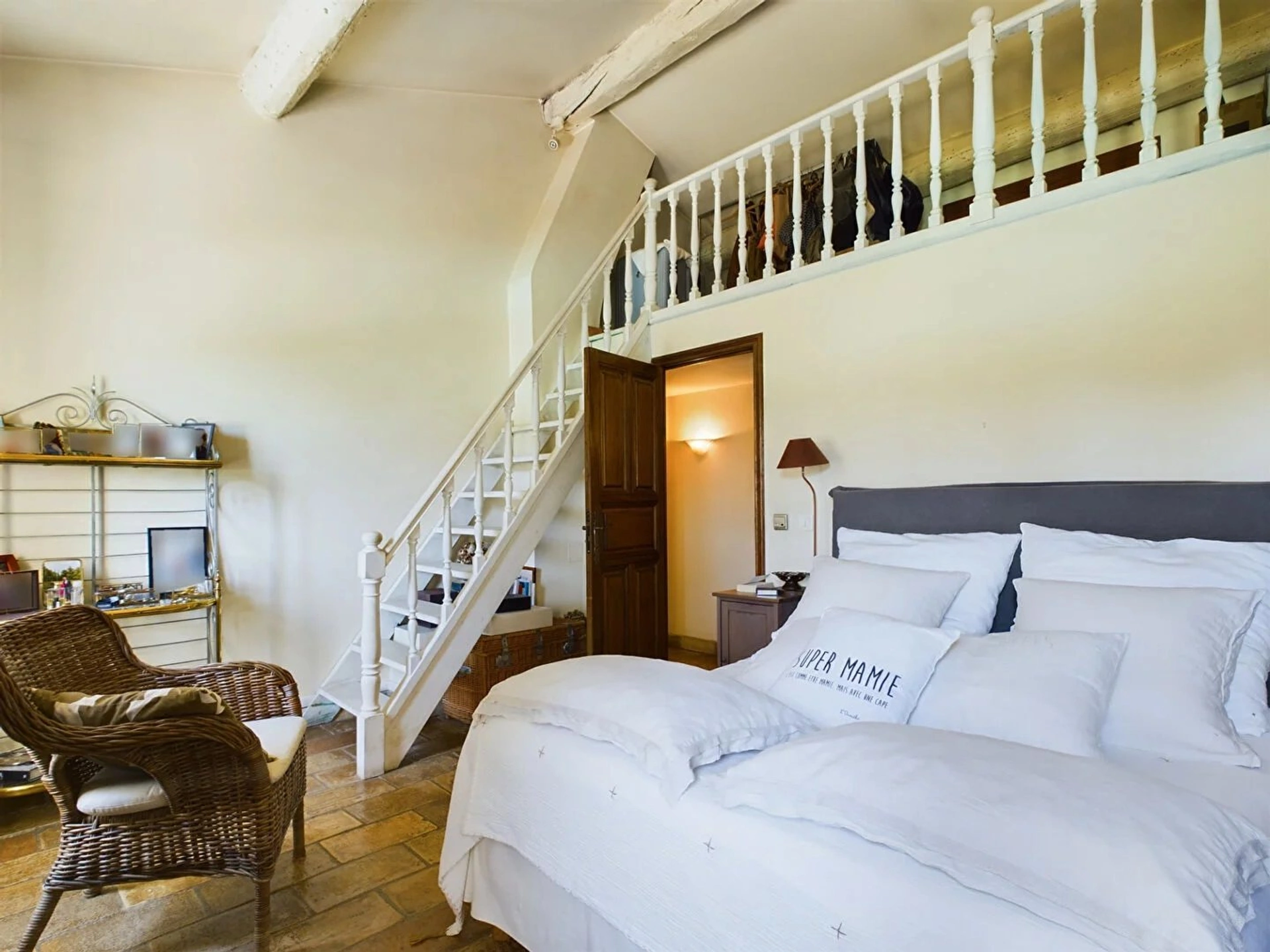 A l'étage, une grande chambre avec de belles hauteurs sous plafond, une chambre avec mezzanine et une salle de bains avec double vasque desservant les deux chambres.