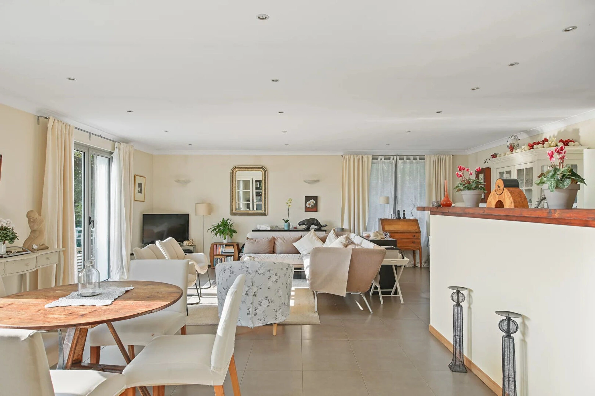 A l'étage, un hall d'entrée dessert une vaste pièce de vie traversante d'environ 50 m², avec cuisine américaine et accès à deux terrasses. Vous y trouverez également une spacieuse suite parentale avec salle de bain privative.