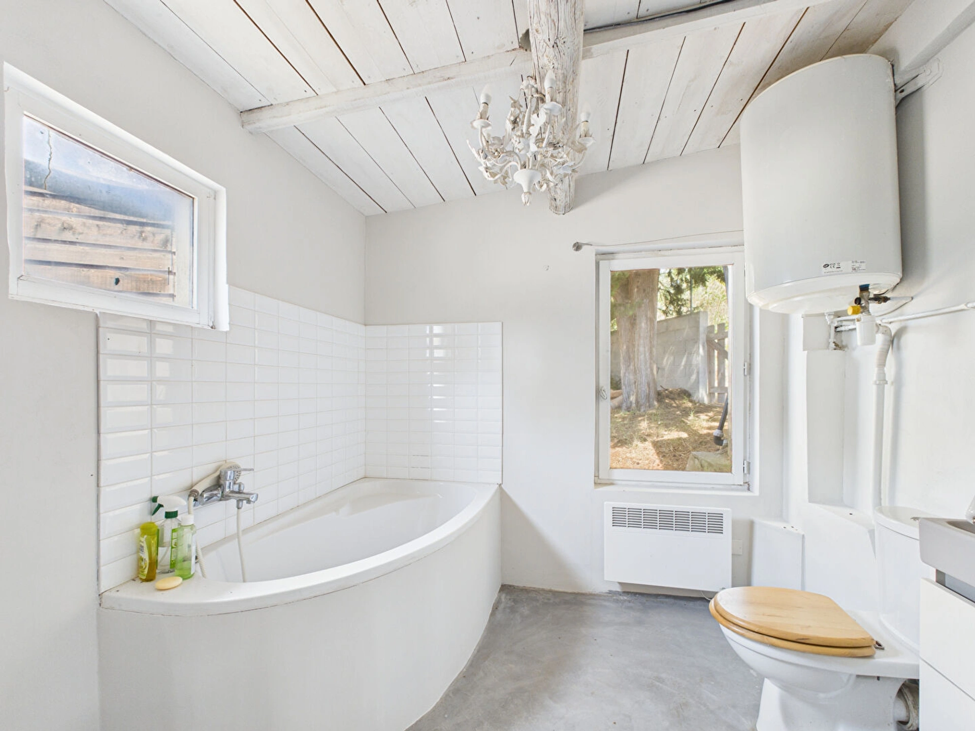 De plain-pied, cette maison est composée de 3 chambres avec 1 salle de bain et 1 salle d'eau, un grand salon avec une magnifique cheminée, un espace dînatoire pouvant accueillir 8 personnes ainsi qu'une petite cuisine fonctionnelle, aménagée et entièrement équipée. Le jardin arboré de 2 370m².
