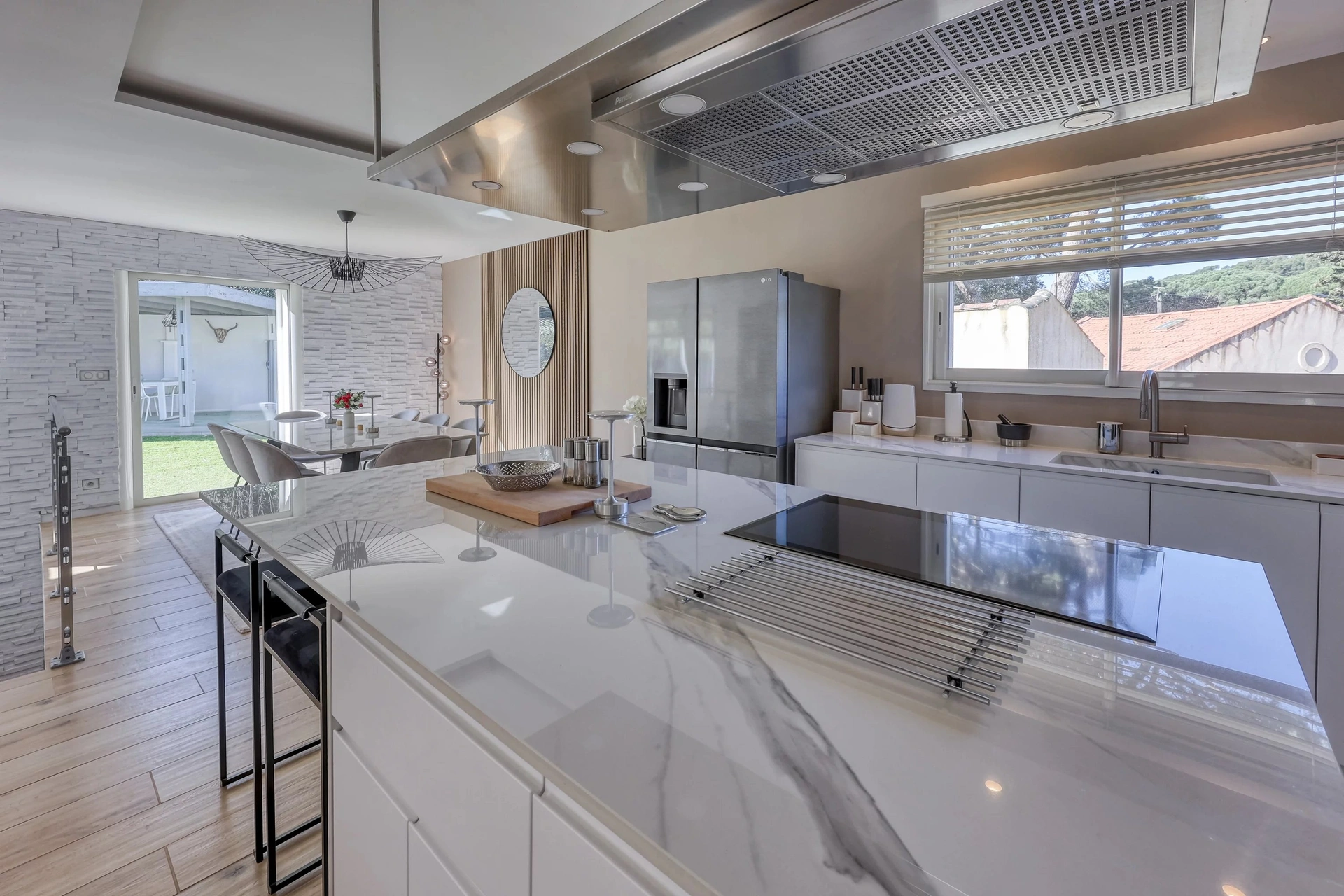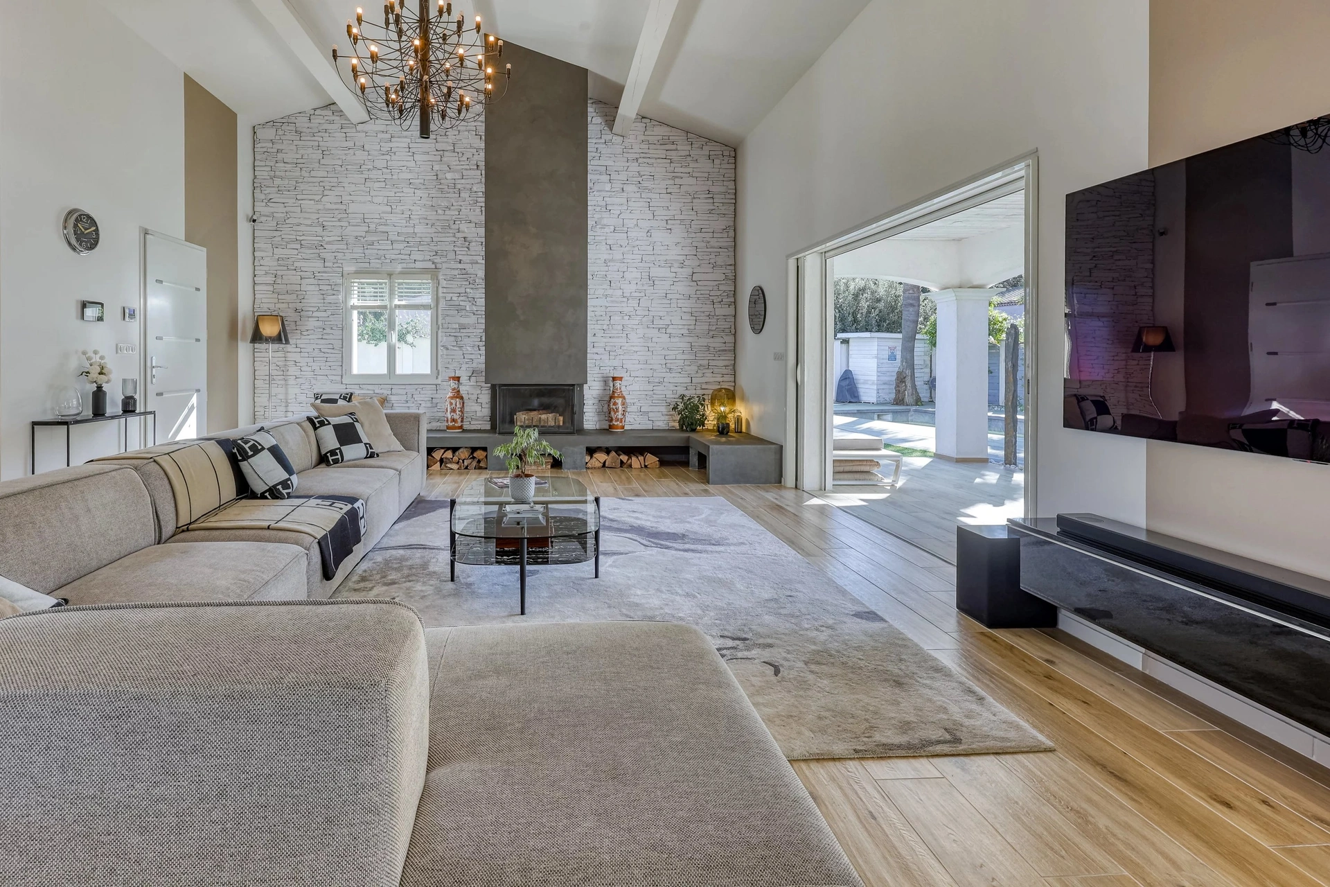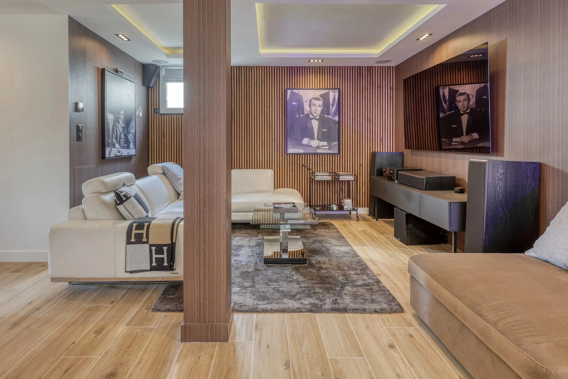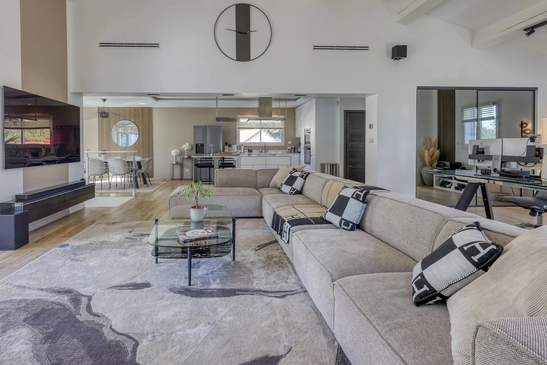 La pièce de vie principale de 80 m², sublimée par une hauteur sous plafond supérieure à 5 mètres, constitue le cœur de la maison. Baignée de lumière, elle accueille un salon élégant, un espace home cinéma et une cuisine haut de gamme parfaitement intégrée dans un ensemble spectaculaire et chaleureux.