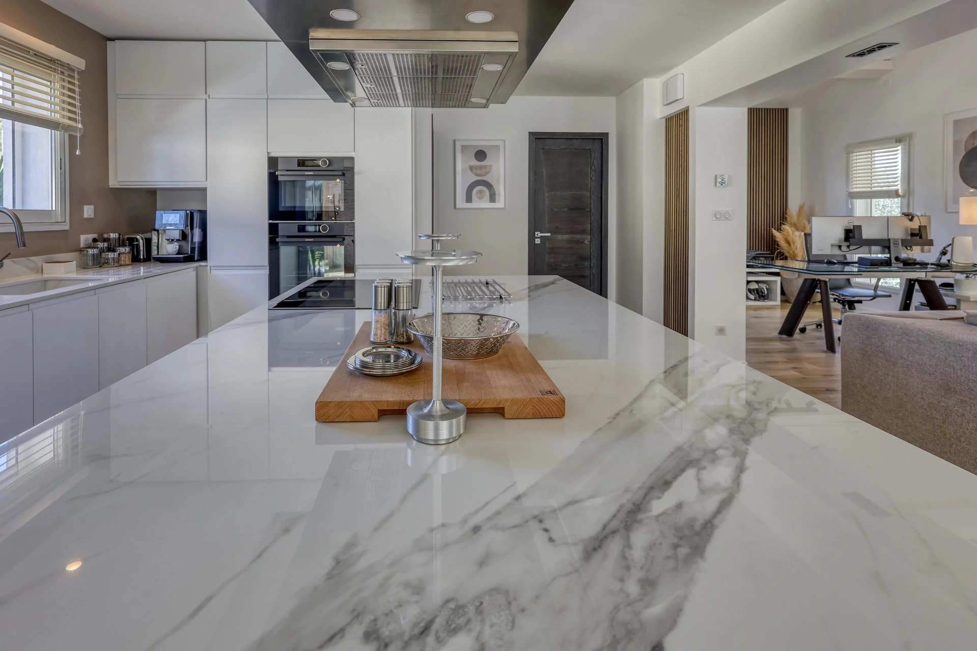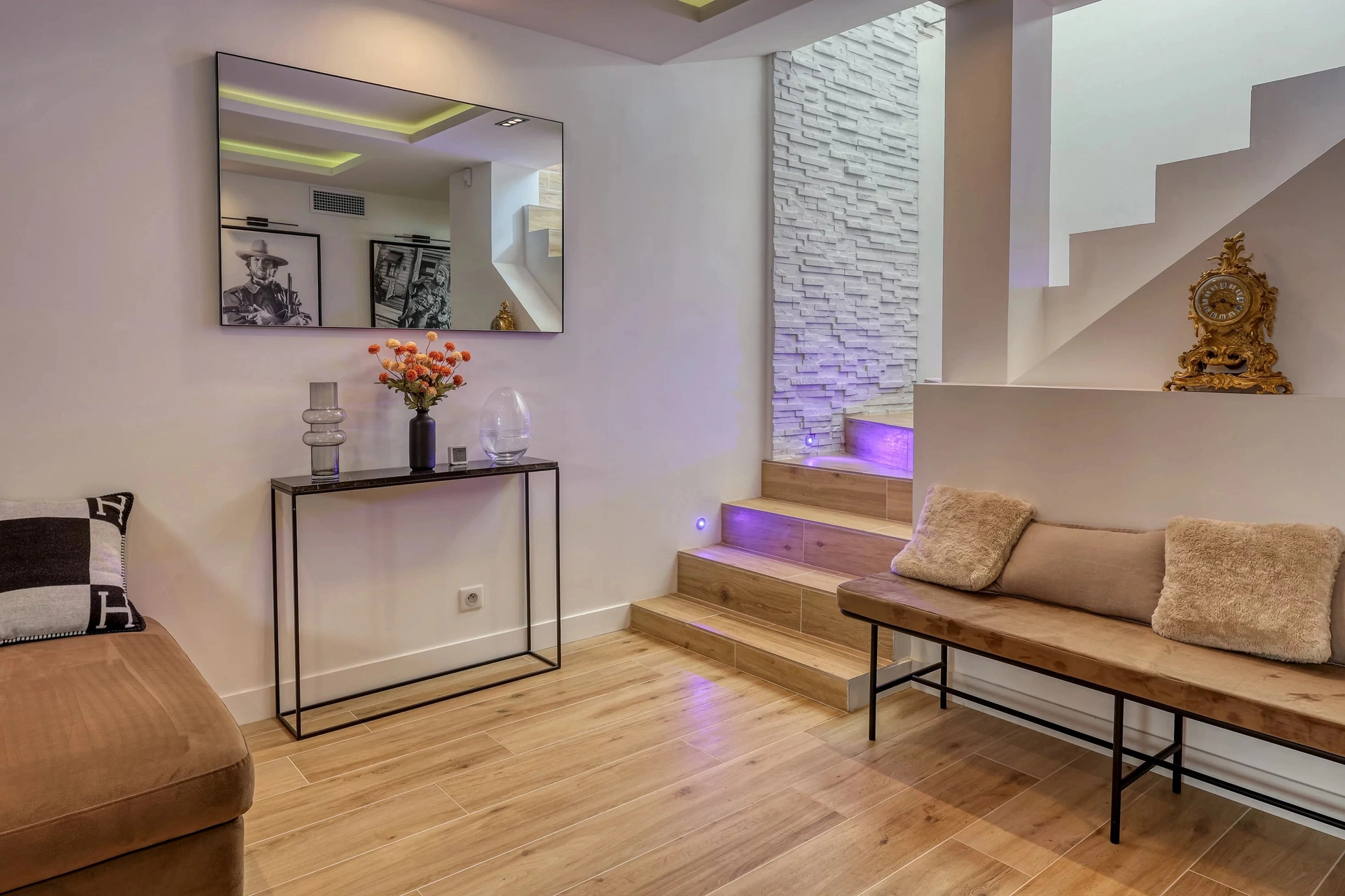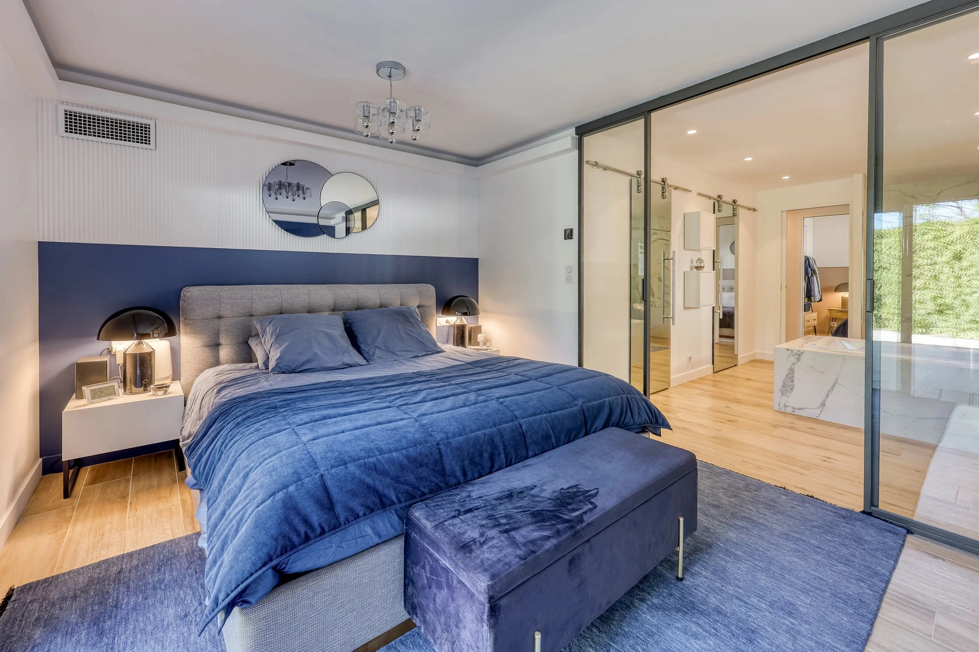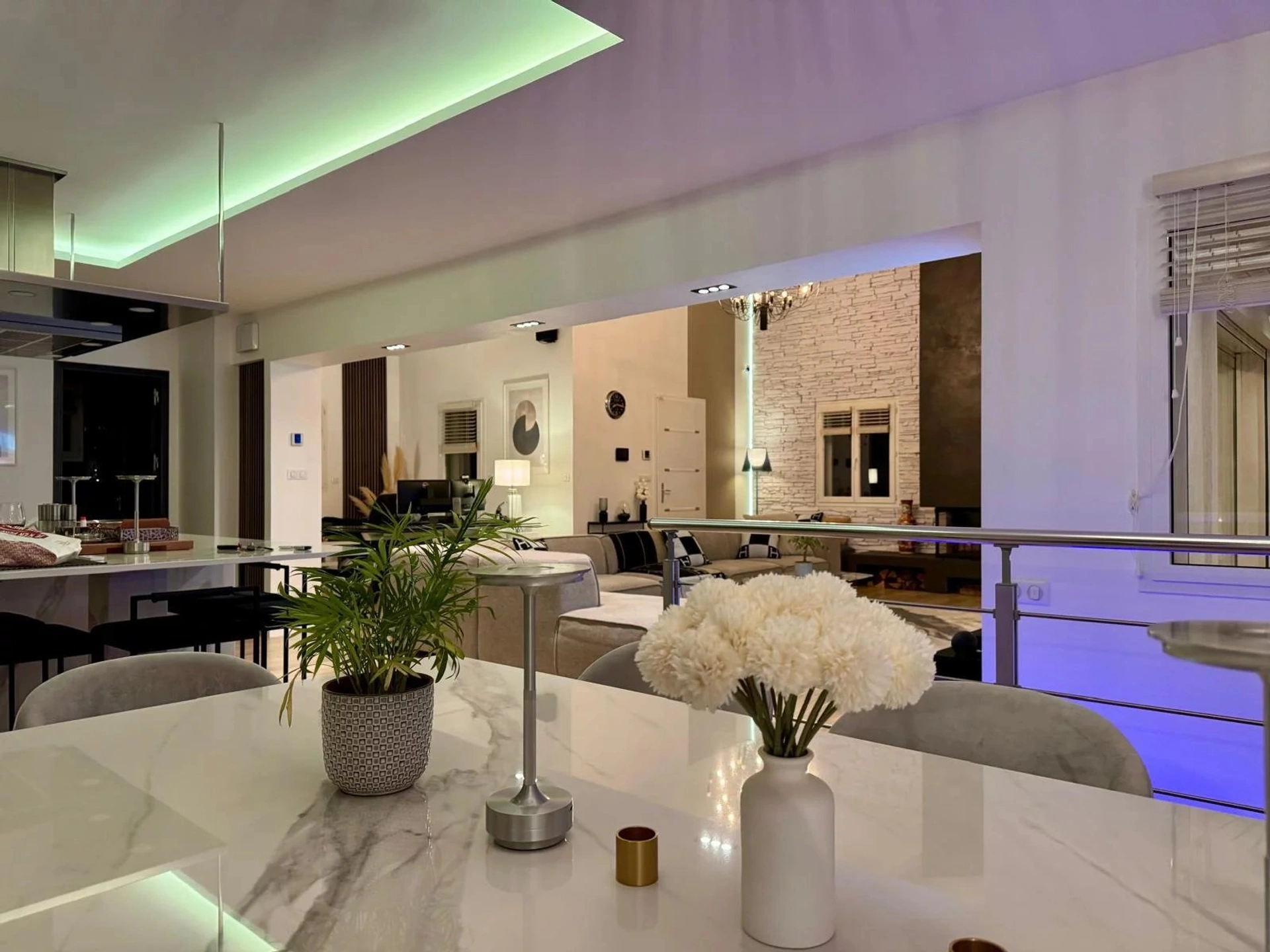 La pièce de vie principale de 80 m², sublimée par une hauteur sous plafond supérieure à 5 mètres, constitue le cœur de la maison. Baignée de lumière, elle accueille un salon élégant, un espace home cinéma et une cuisine haut de gamme parfaitement intégrée dans un ensemble spectaculaire et chaleureux.