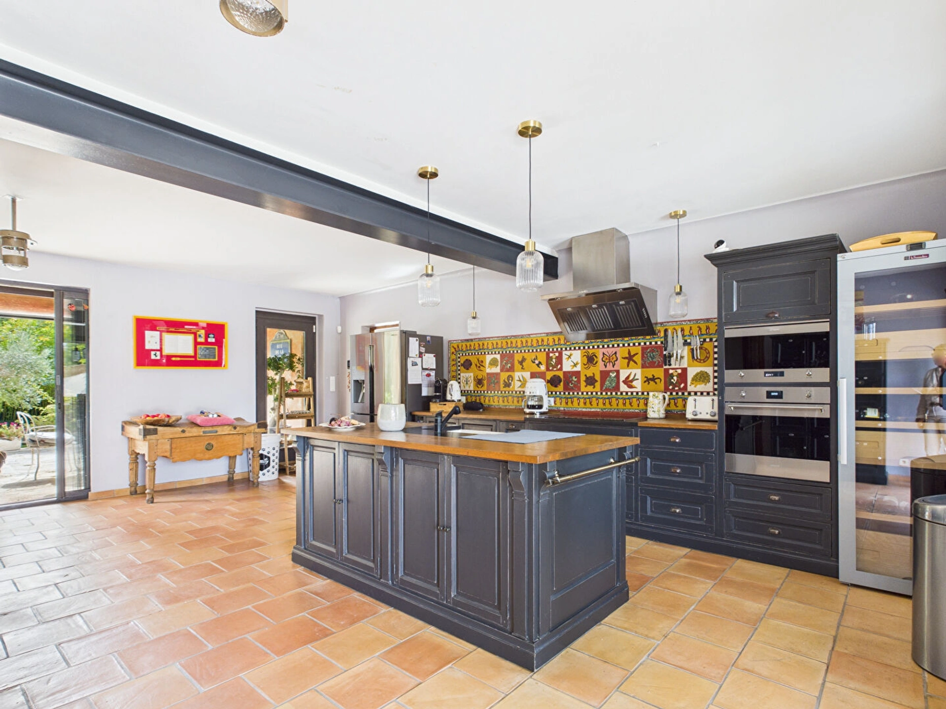 Dès l'entrée, vous serez séduit par une cuisine indépendante de caractère, suivie d'un vaste séjour de plus de 96 m², sublimé par une cheminée en pierre et de superbes poutres apparentes, créant une atmosphère chaleureuse et conviviale.
