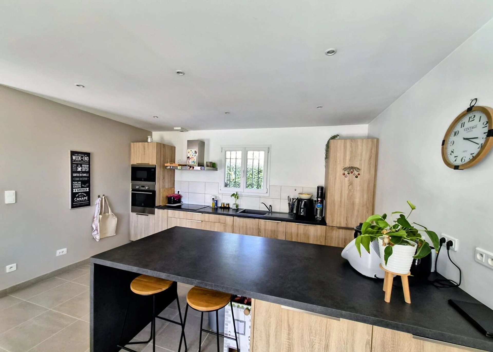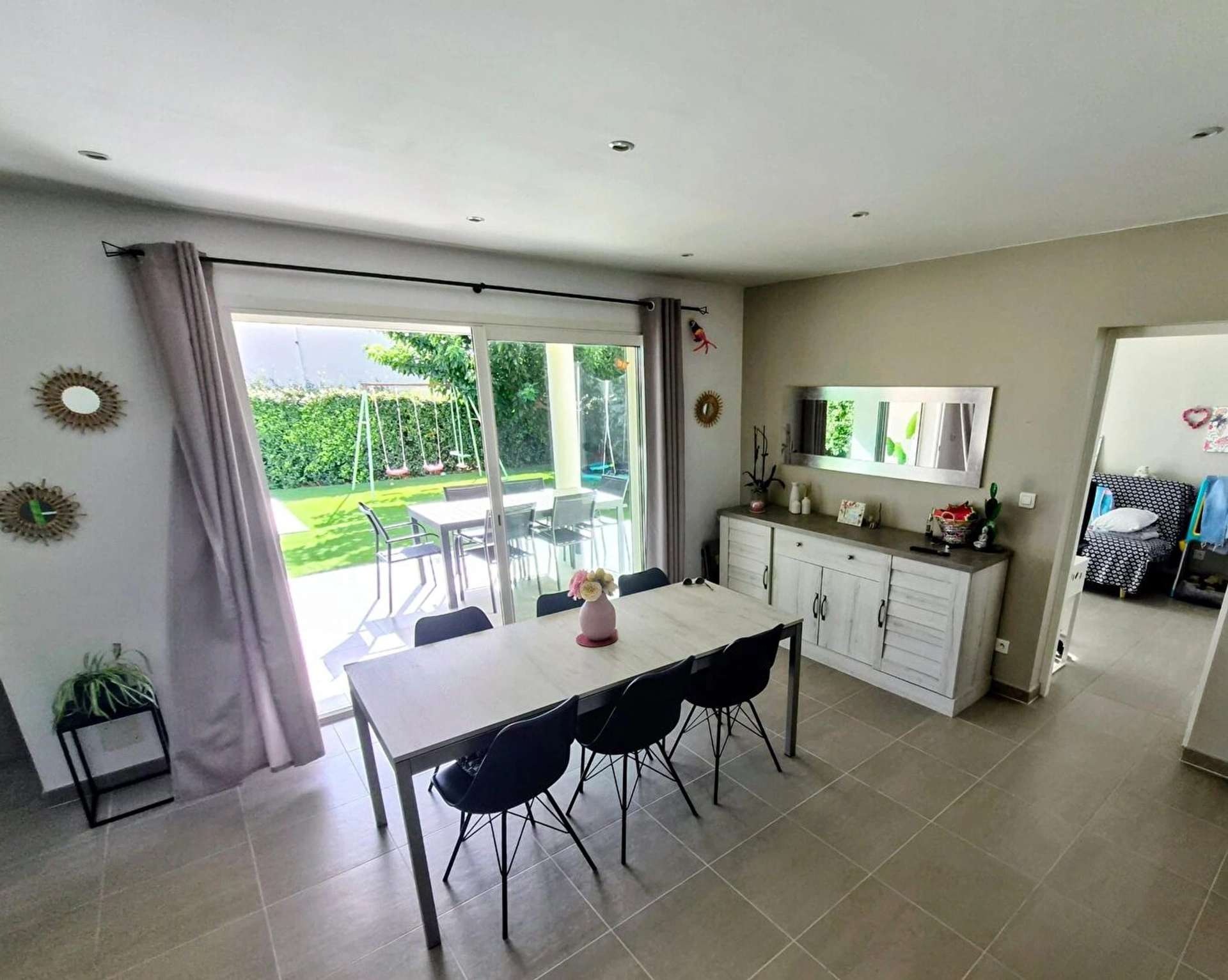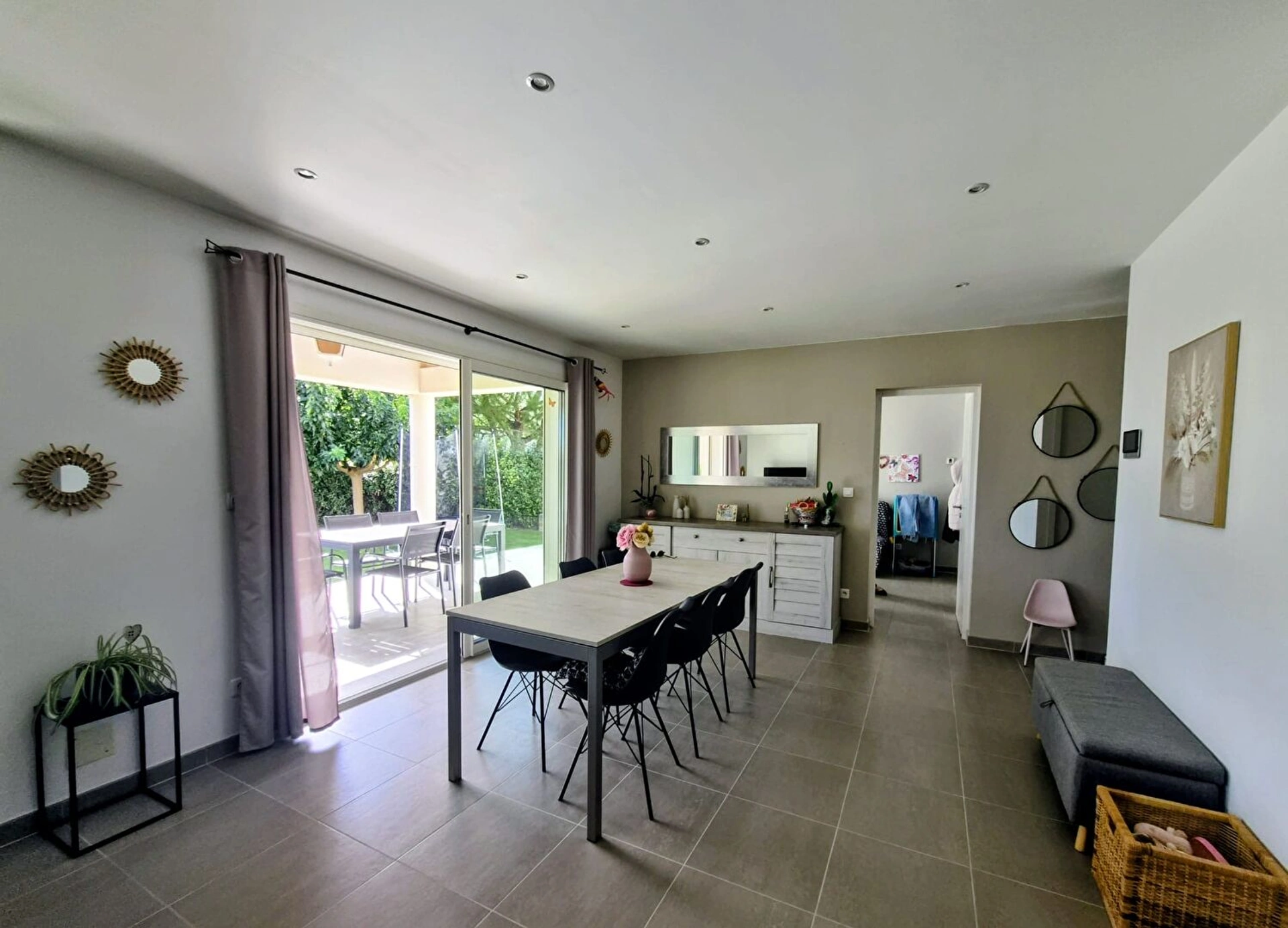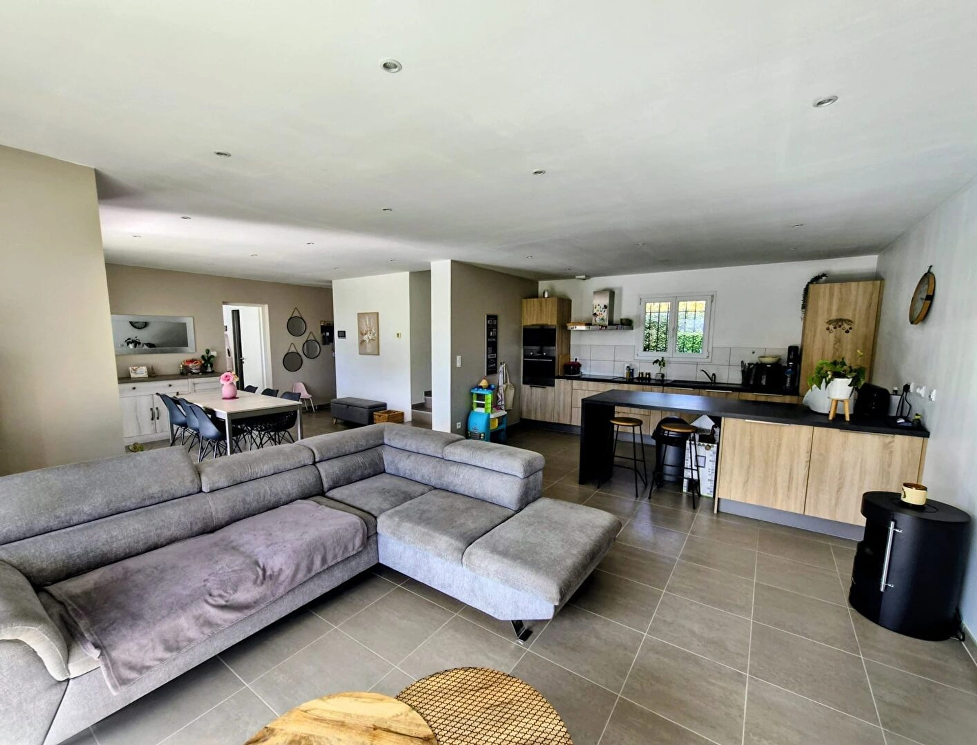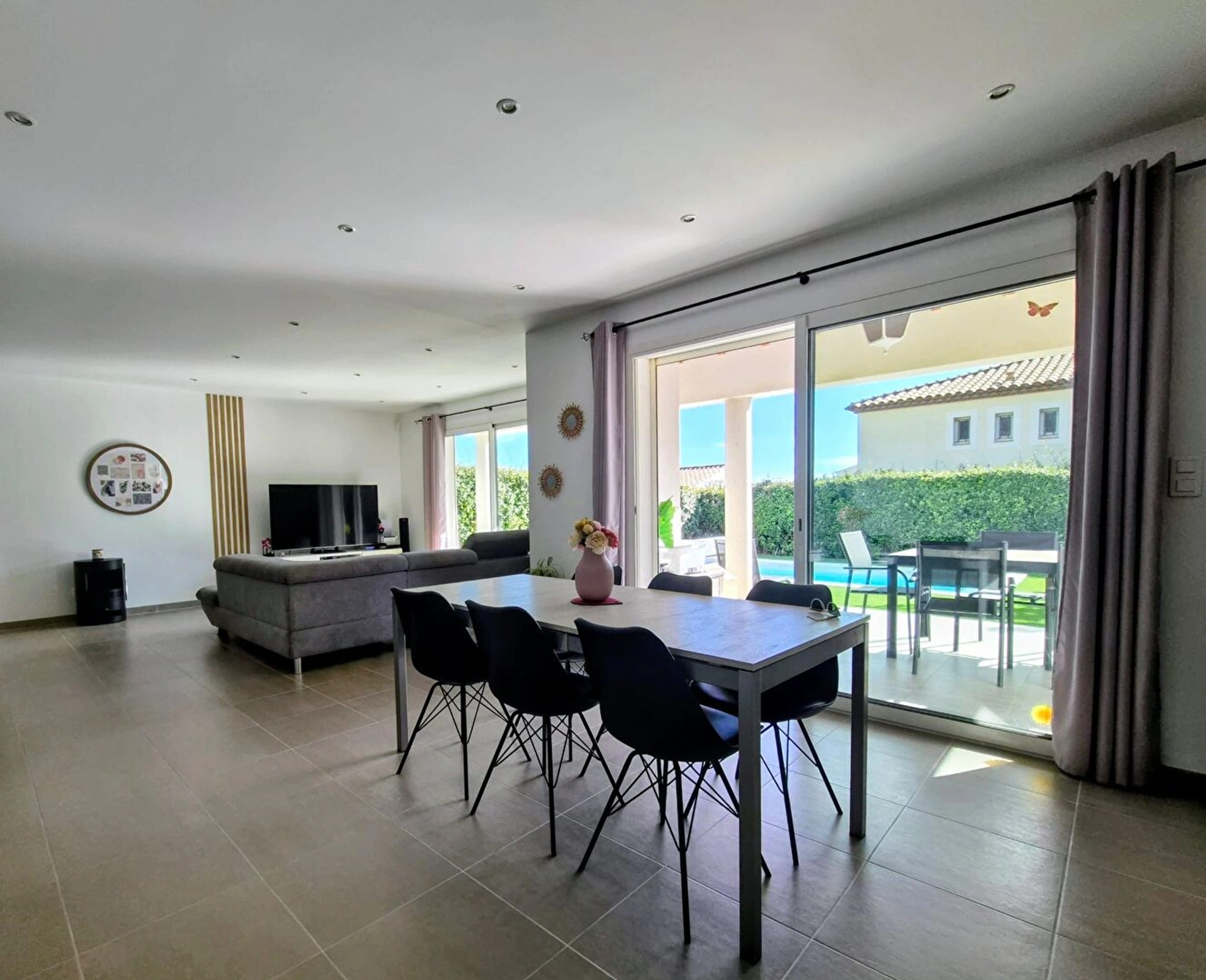Belle pièce de vie lumineuse avec salon / salle à manger et cuisine ouverte équipée ouvrant sur une grande et lumineuse terrasse sur jardin et piscine.