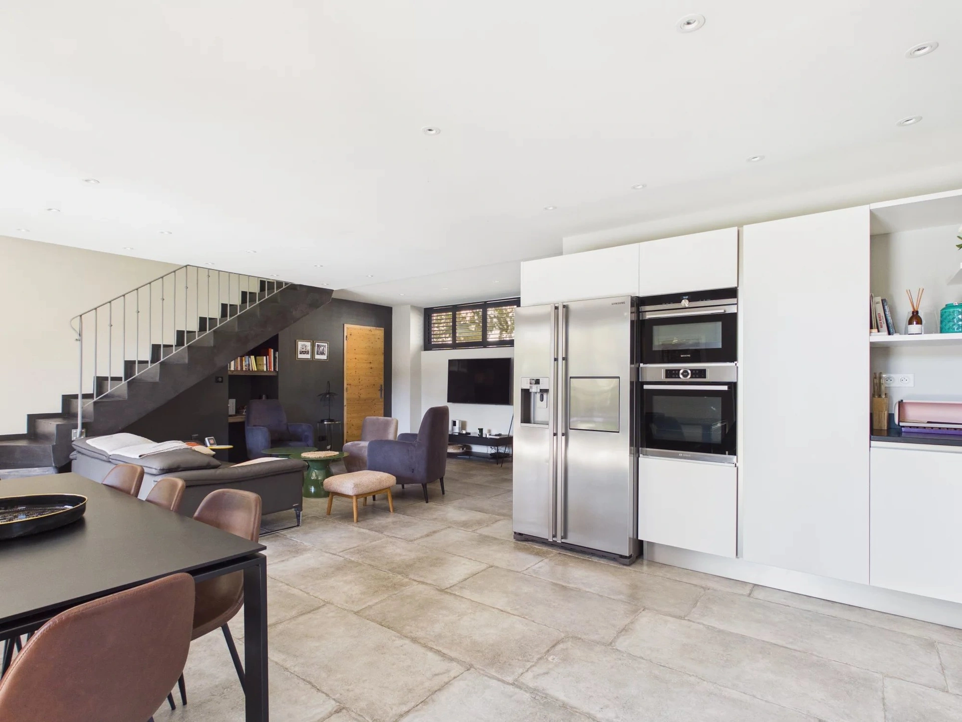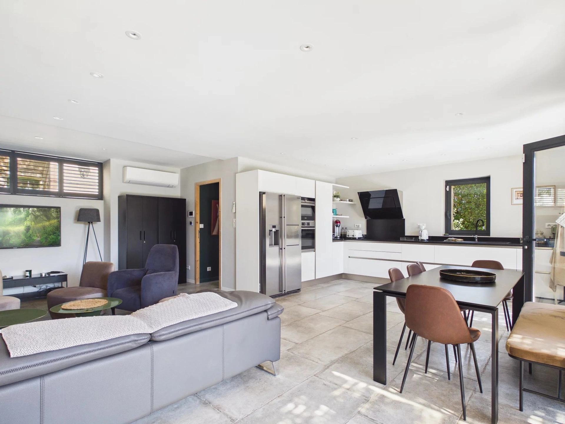 La maison propose de beaux espaces de vie lumineux avec salon, salle à manger et cuisine ouverte, donnant directement sur la terrasse et le jardin.