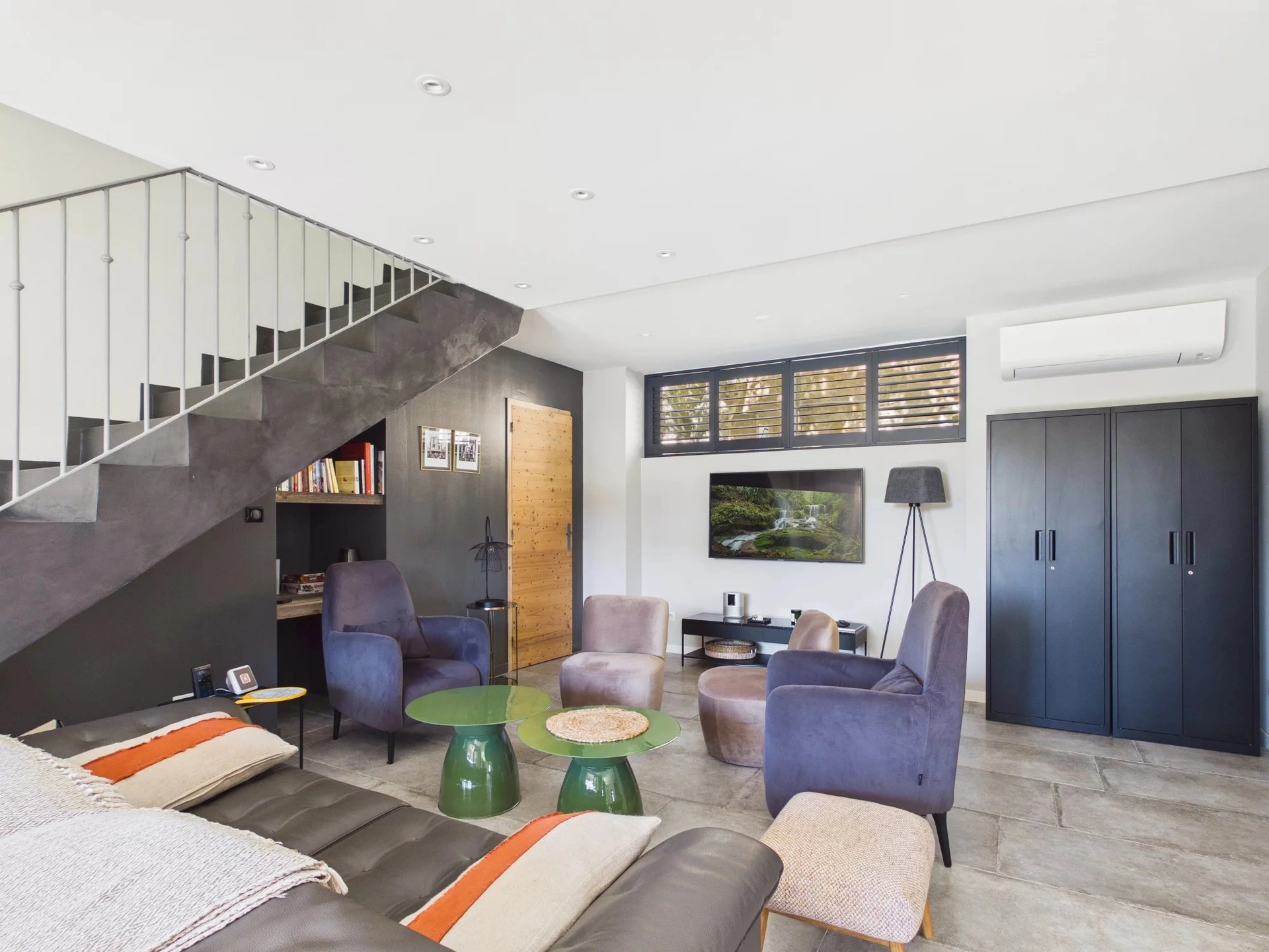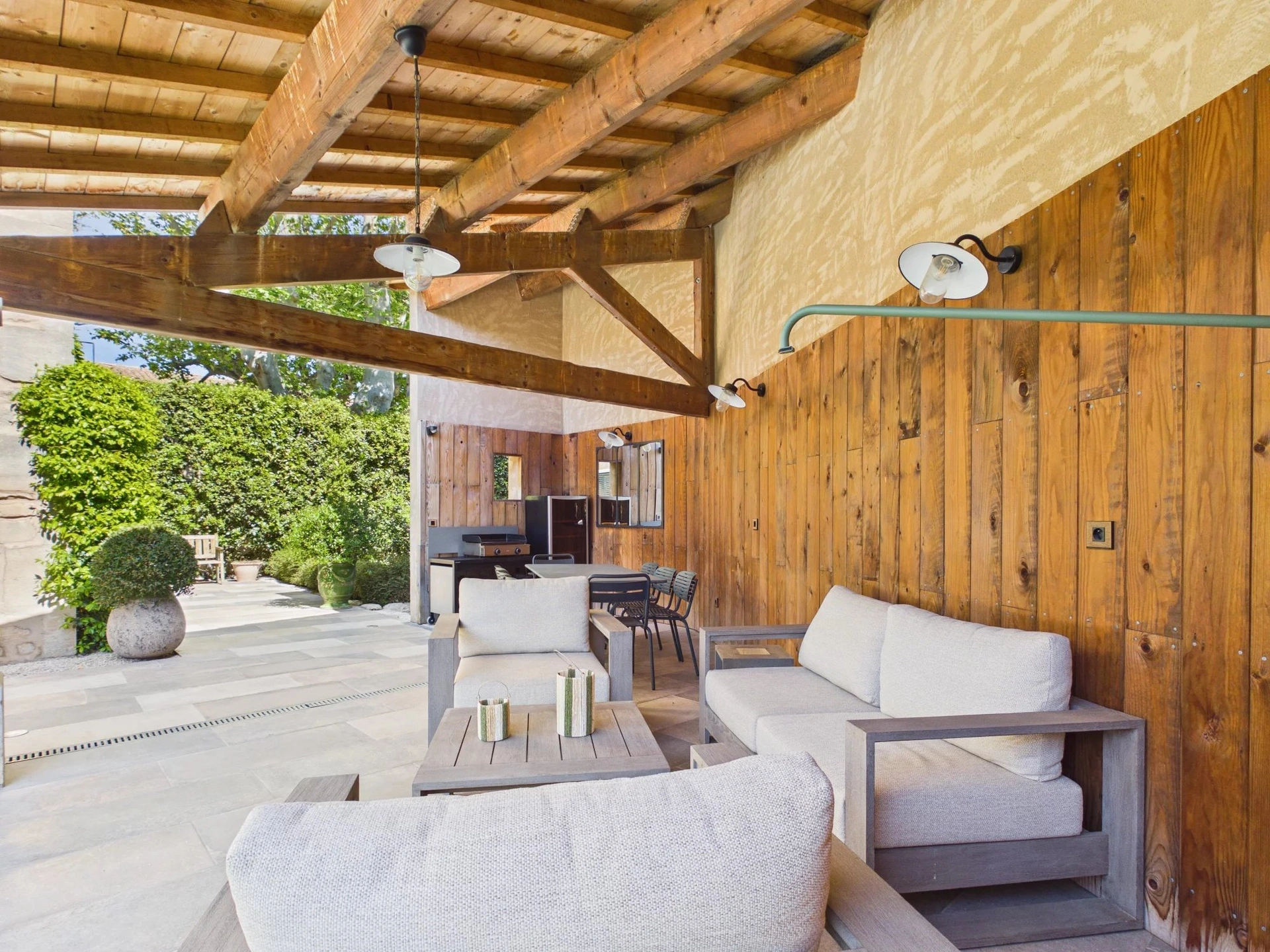 À l’extérieur, le terrain clos de 517 m² accueille plusieurs espaces aménagés pour profiter pleinement des journées ensoleillées : terrasses ombragées, coin repas et espaces détente.