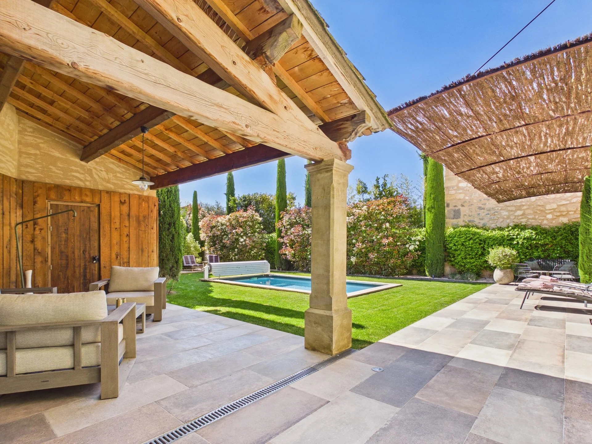 La piscine chauffée de 6 x 3 m complète l’ensemble, idéale pour se rafraîchir et partager des moments conviviaux.
