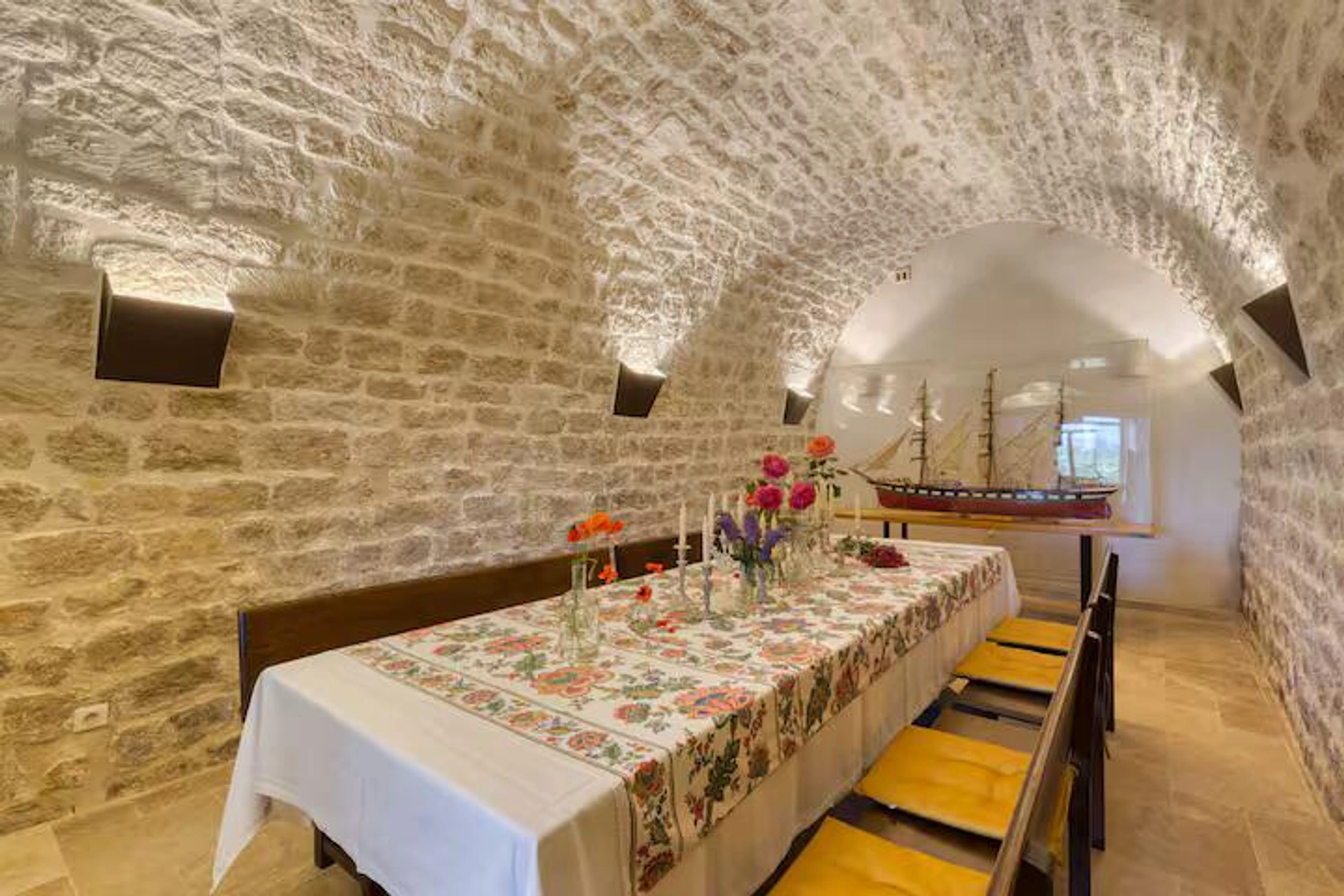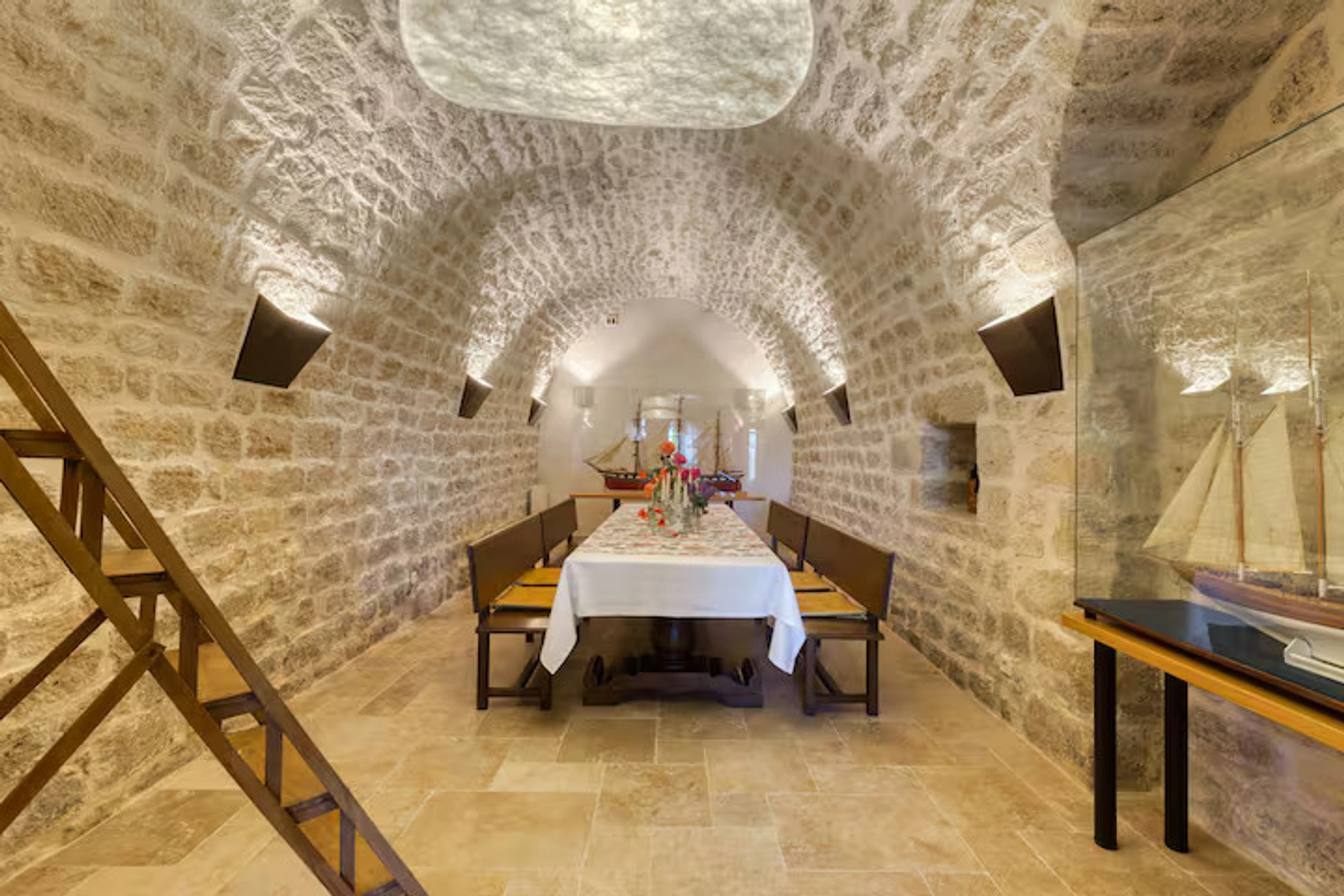 Au rez-de-jardin, une grande chambre double, la chambre "Ernest" donne accès directement au grand salon, idéale pour les enfants. Discrète avec ses vitres teintées, sa voûte en anse de panier et ses murs en pierres apparentes apportant une fraîcheur naturelle, elle bénéficie également de sa salle d’eau.