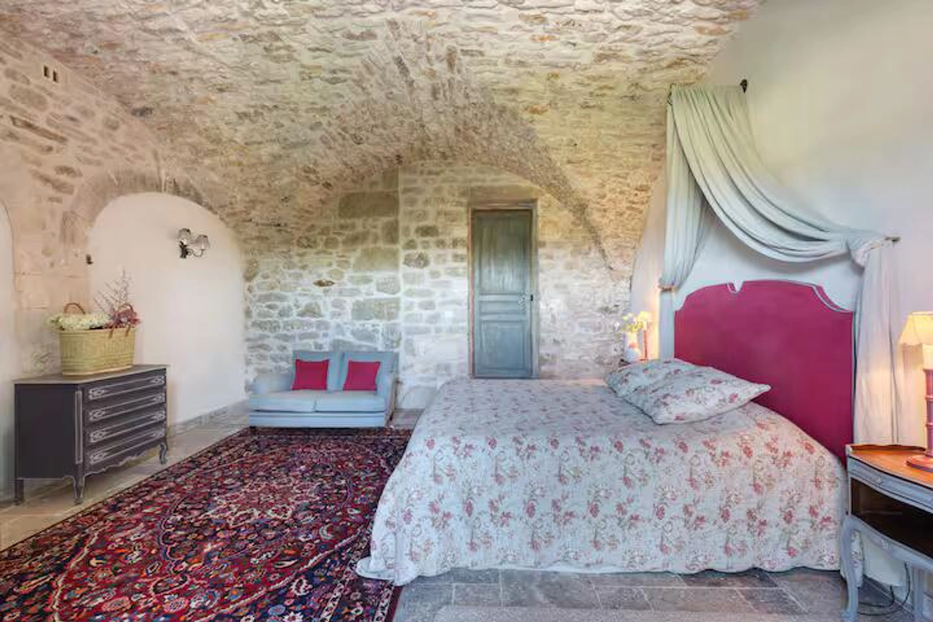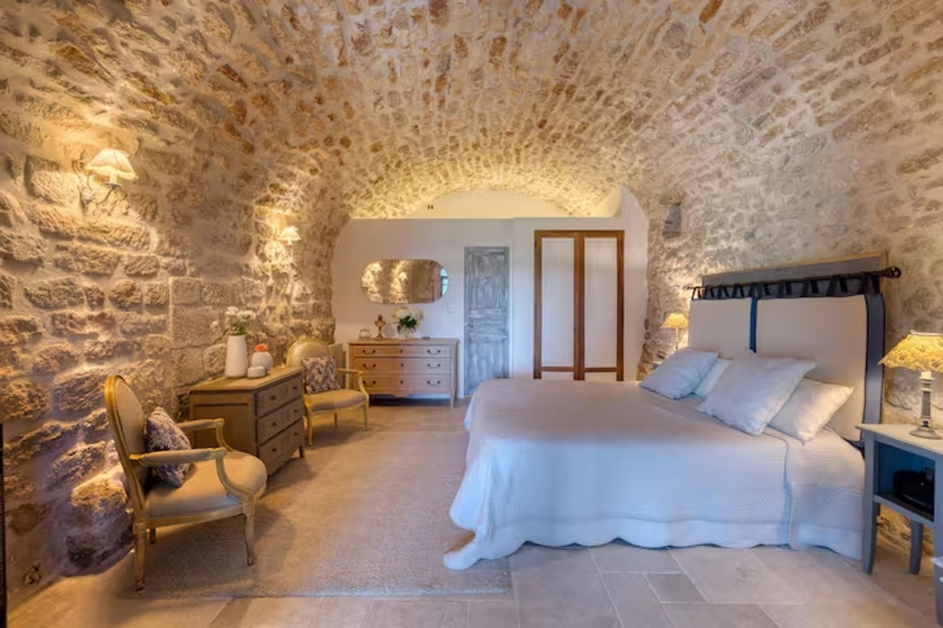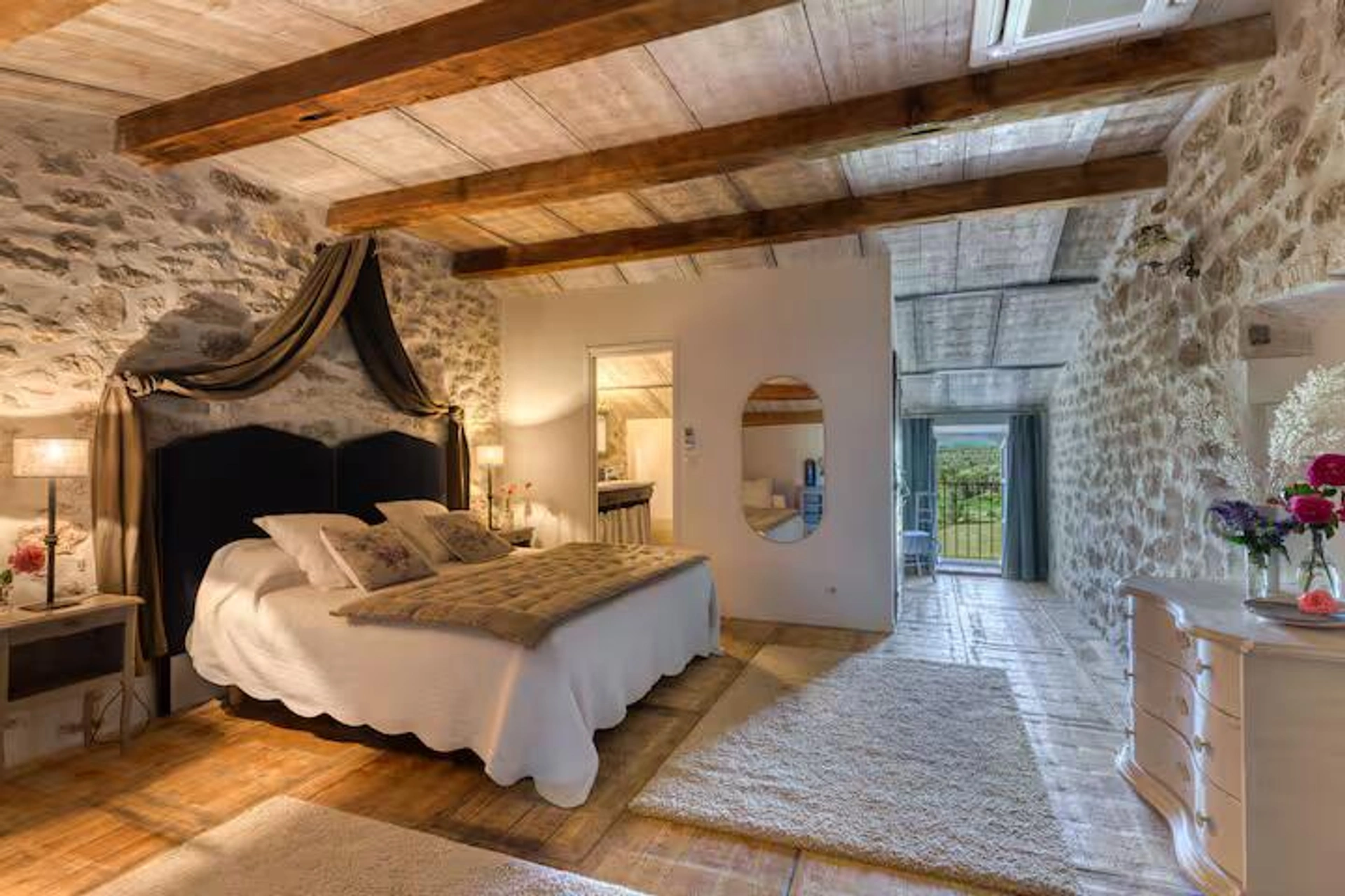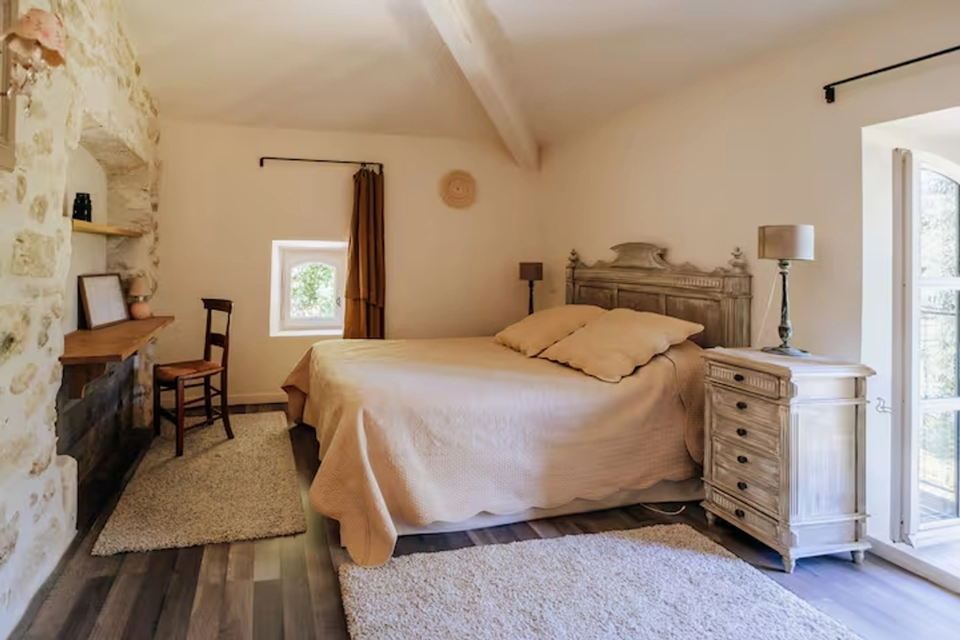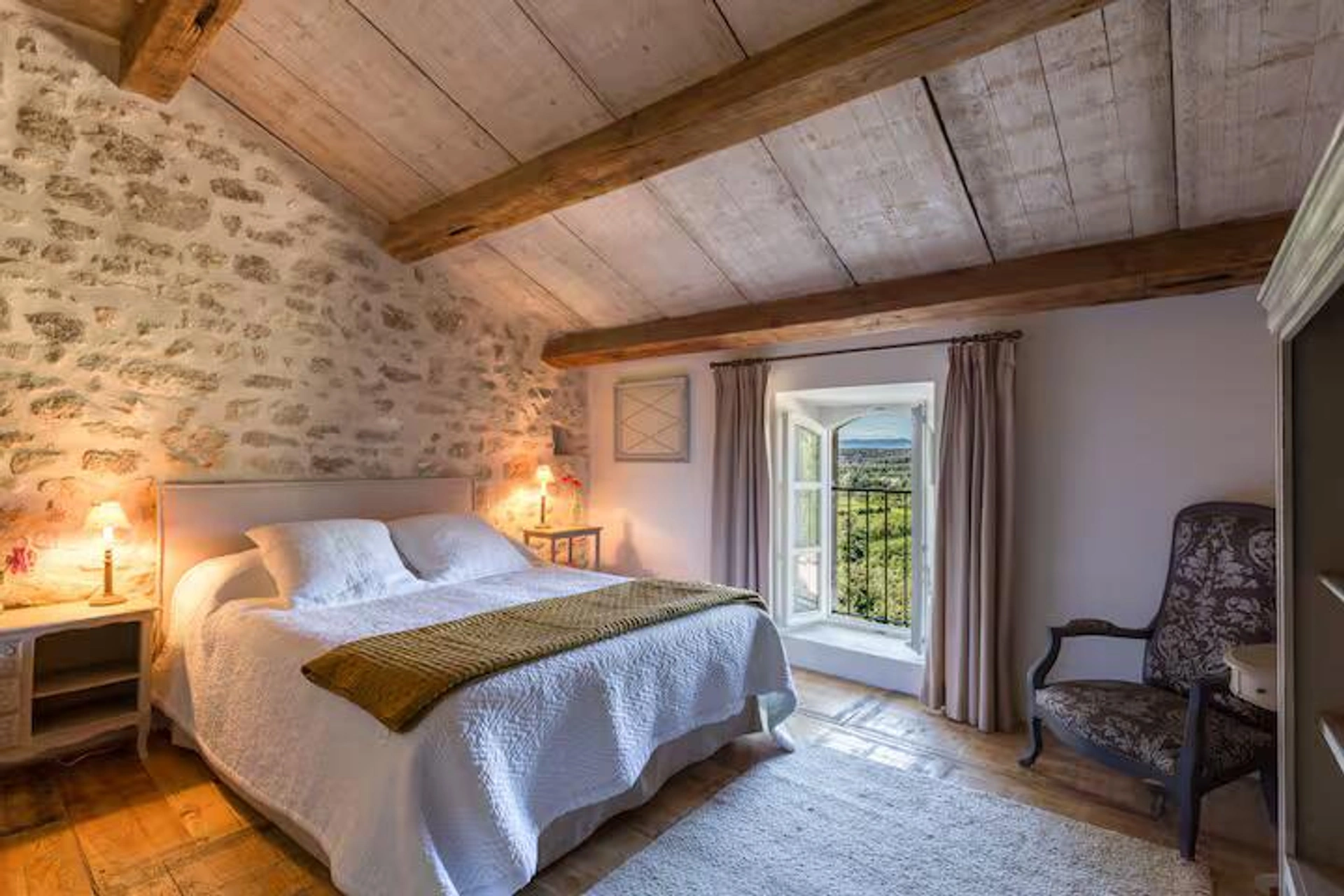 - Chambre "Gatsby" : Une grande chambre double avec vue sur le Mont Ventoux, murs en pierre et plafonds à l’ancienne.