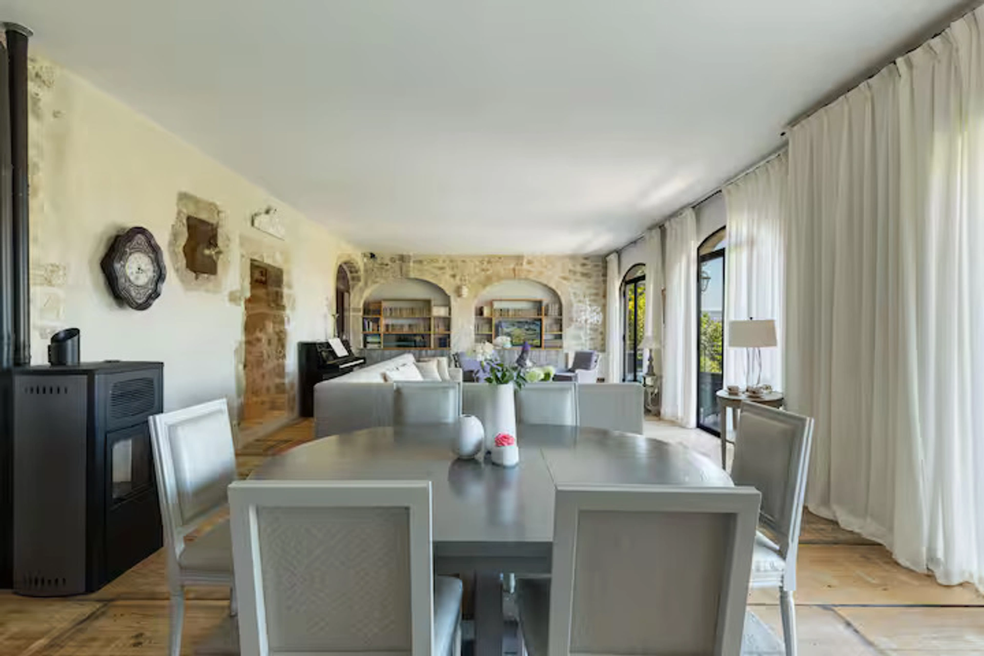 La maison principale s’organise sur plusieurs niveaux et comprend des salons, salles à manger et cuisines équipées, permettant de partager des moments conviviaux tout en conservant des espaces distincts.
