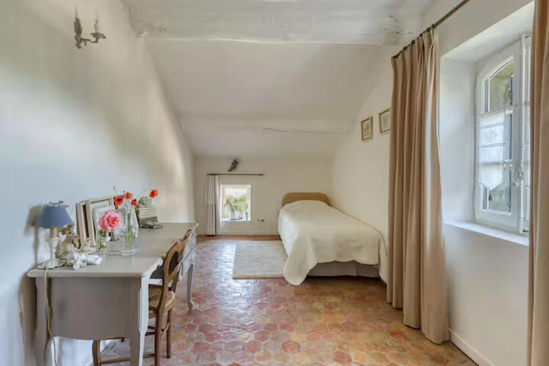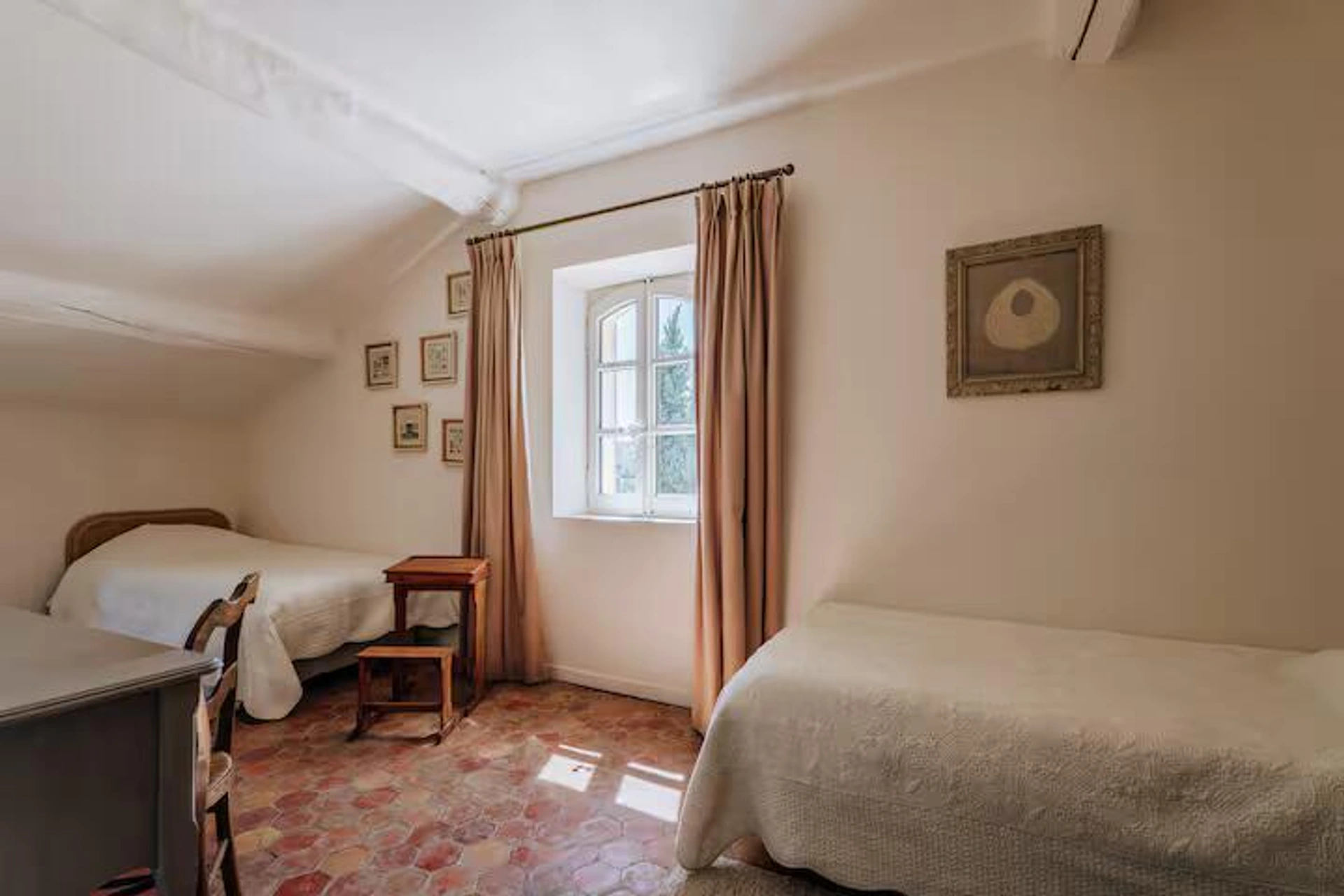 - Chambre "Marcel" : Une suite parentale composée de deux chambres communicantes, avec vue sur le Mont Ventoux, la piscine et la Chapelle Notre Dame des Grâces. Murs de pierre, parquet à l’ancienne pour la chambre parentale et tomettes pour celle des enfants.