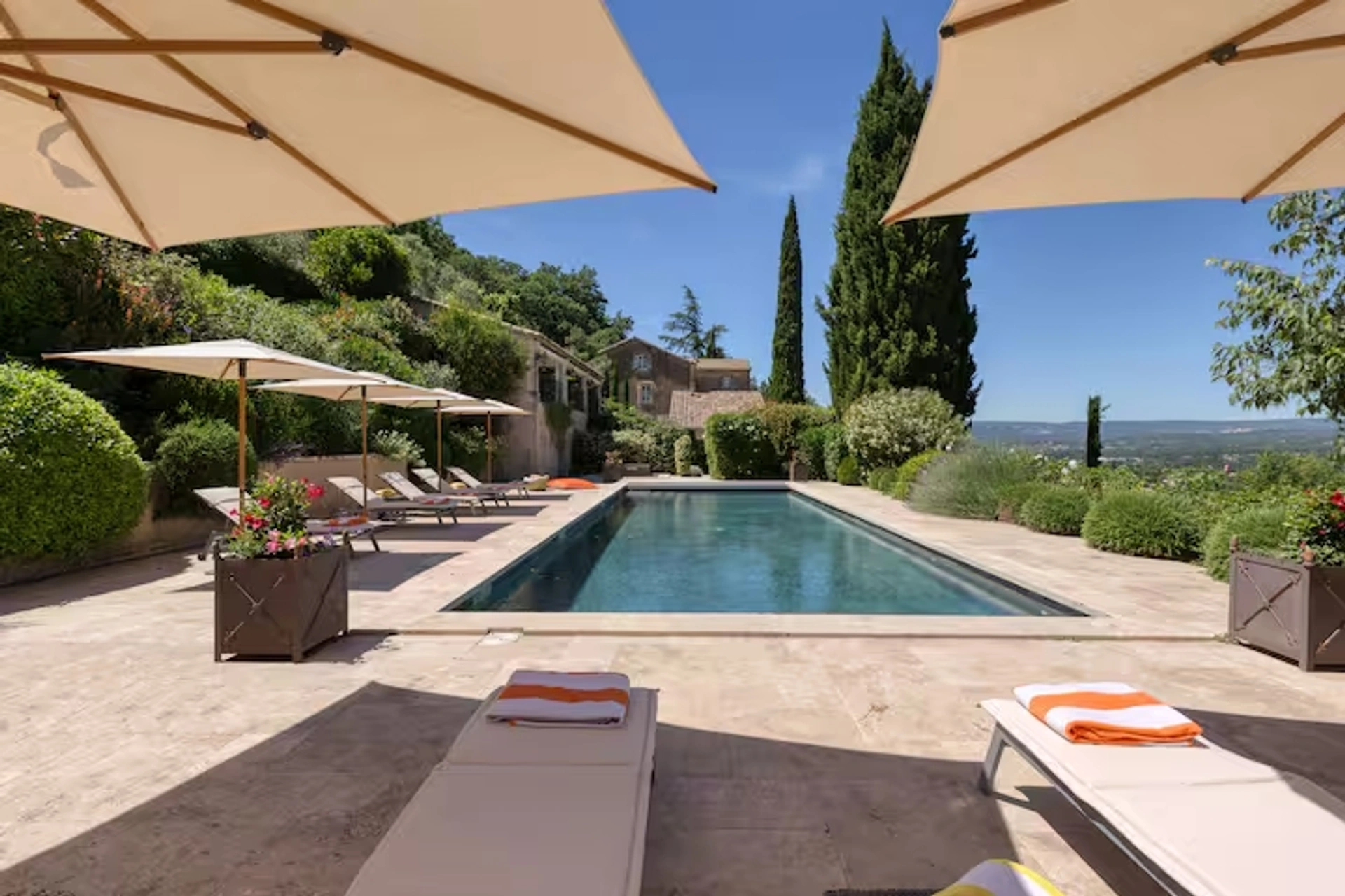 Deux piscines, dont une de 15 x 5 m, permettent de profiter pleinement des journées ensoleillées, avec une vue ouverte sur les paysages du Luberon.