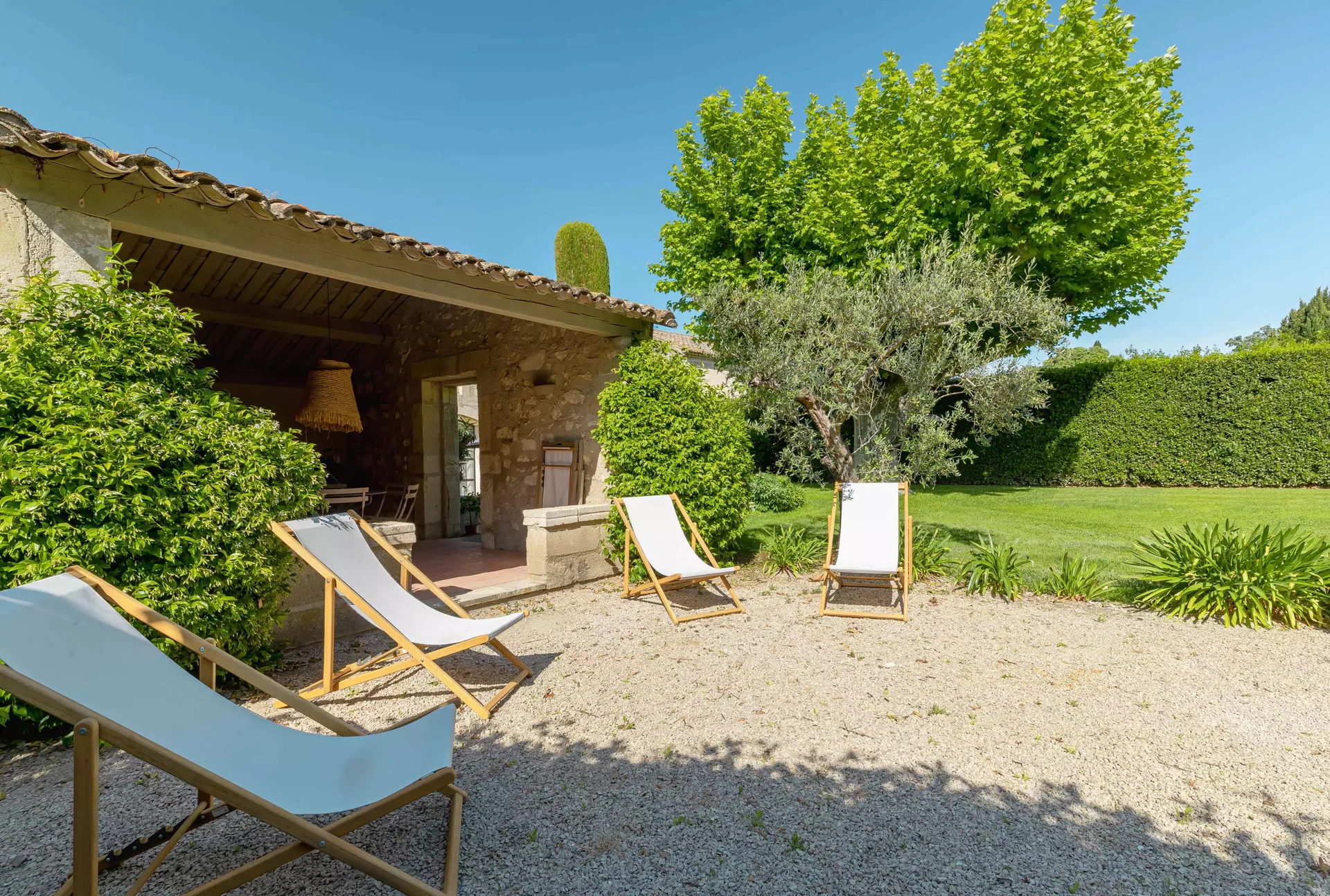 Le mas dispose d'une belle cuisine, d'un coin repas convivial, d'un salon spacieux ouvrant sur une terrasse ombragée et de quatre grandes chambres, chacune équipée de son propre point d'eau, offrant ainsi confort et intimité à tous les occupants.